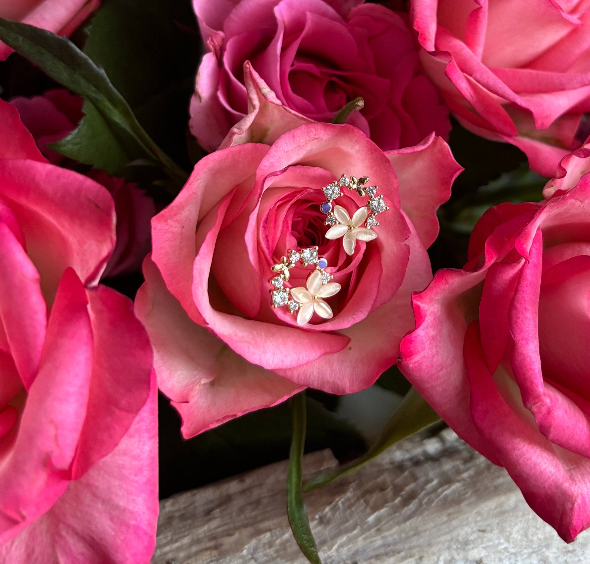 14ct gullbelegget gir en varm glød, mens Cubic Zirconia‑steinene sørger for seriøs sparkle — en liten blomstrende detalj som gjør hele looken litt mer… you 🌼