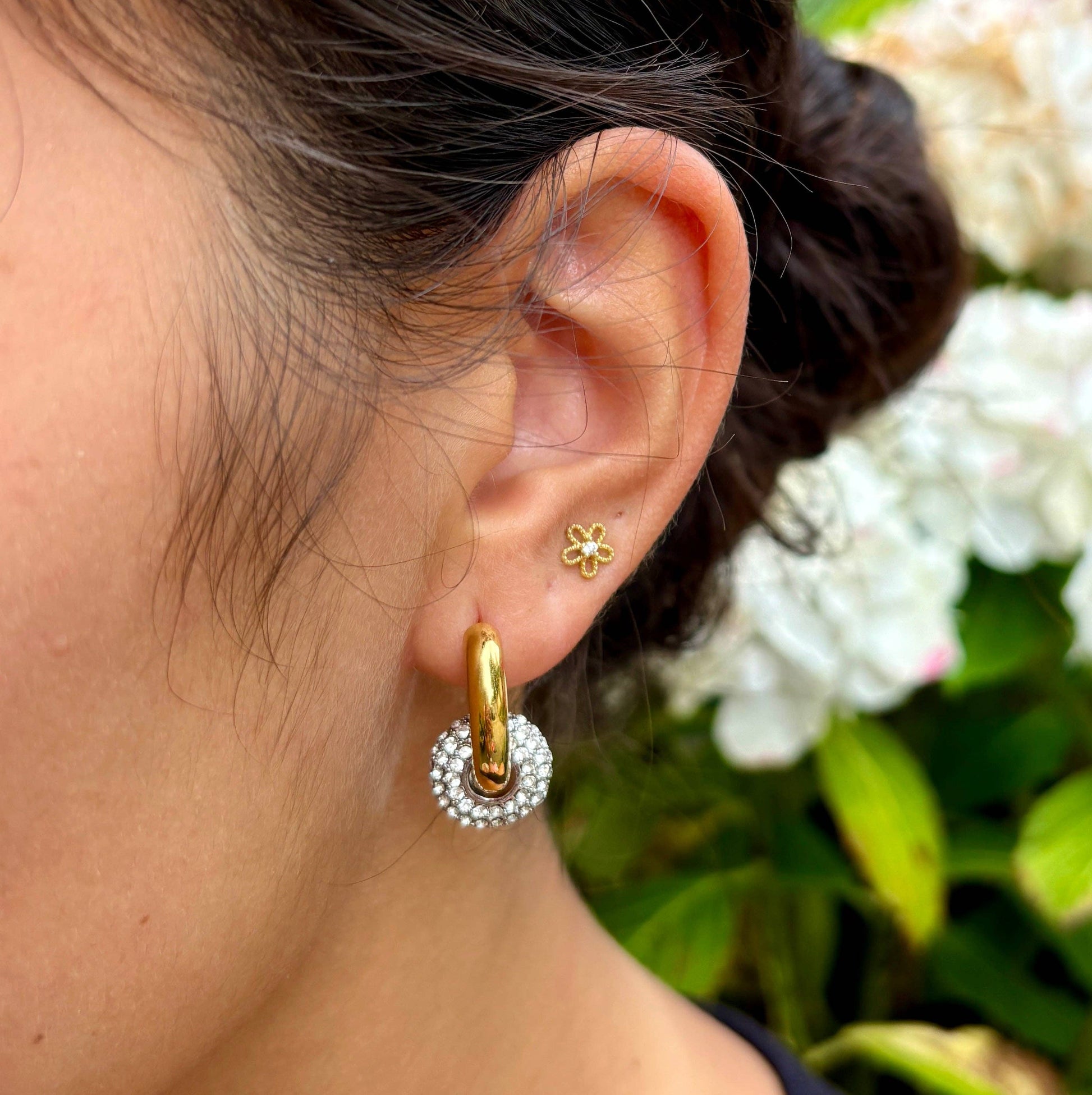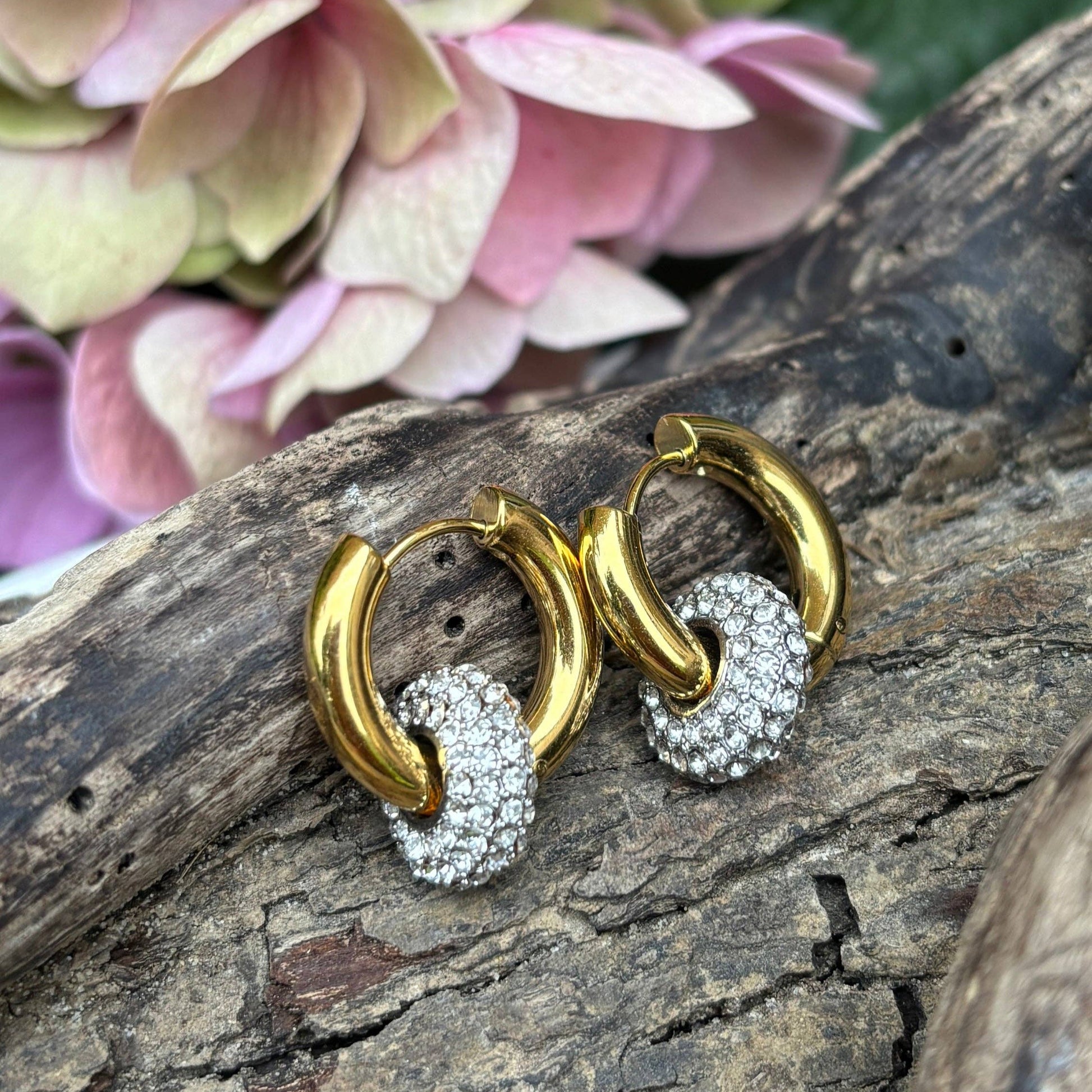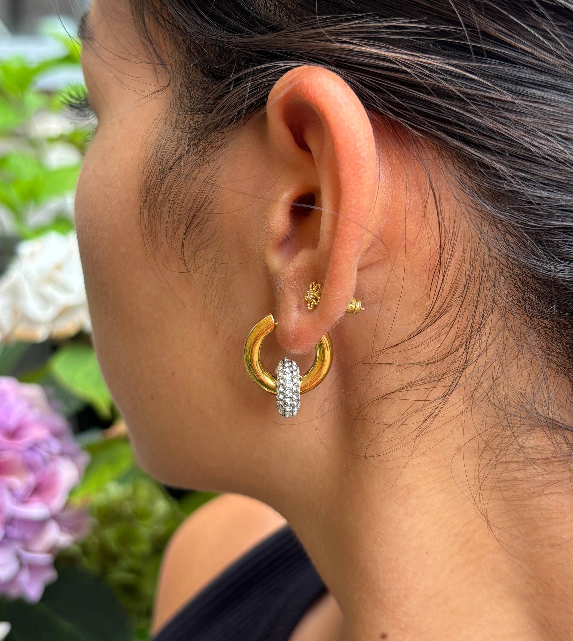 En tykk gullbelagt huggie-ring trer gjennom midten av en glitrende kubisk zirkonia-formet "smultring", og skaper et uttrykksfullt, men raffinert utseende med moderne preg og subtil bevegelse.
