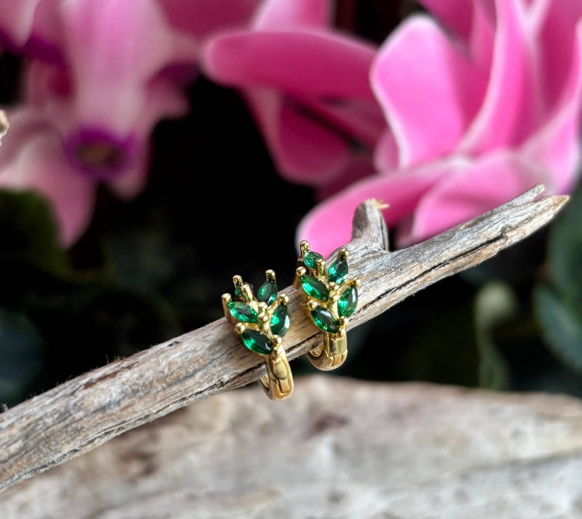 Disse 18 karats gullbelagte Leaf Huggie‑øredobbene gir antrekket et friskt, fargerikt og sofistikert løft ✨ De glitrende cubic zirconia‑bladene kommer i enten livlig grønn eller dyp blå, og tilfører akkurat den lille fargeklatten som gjør hele looken mer spennende.