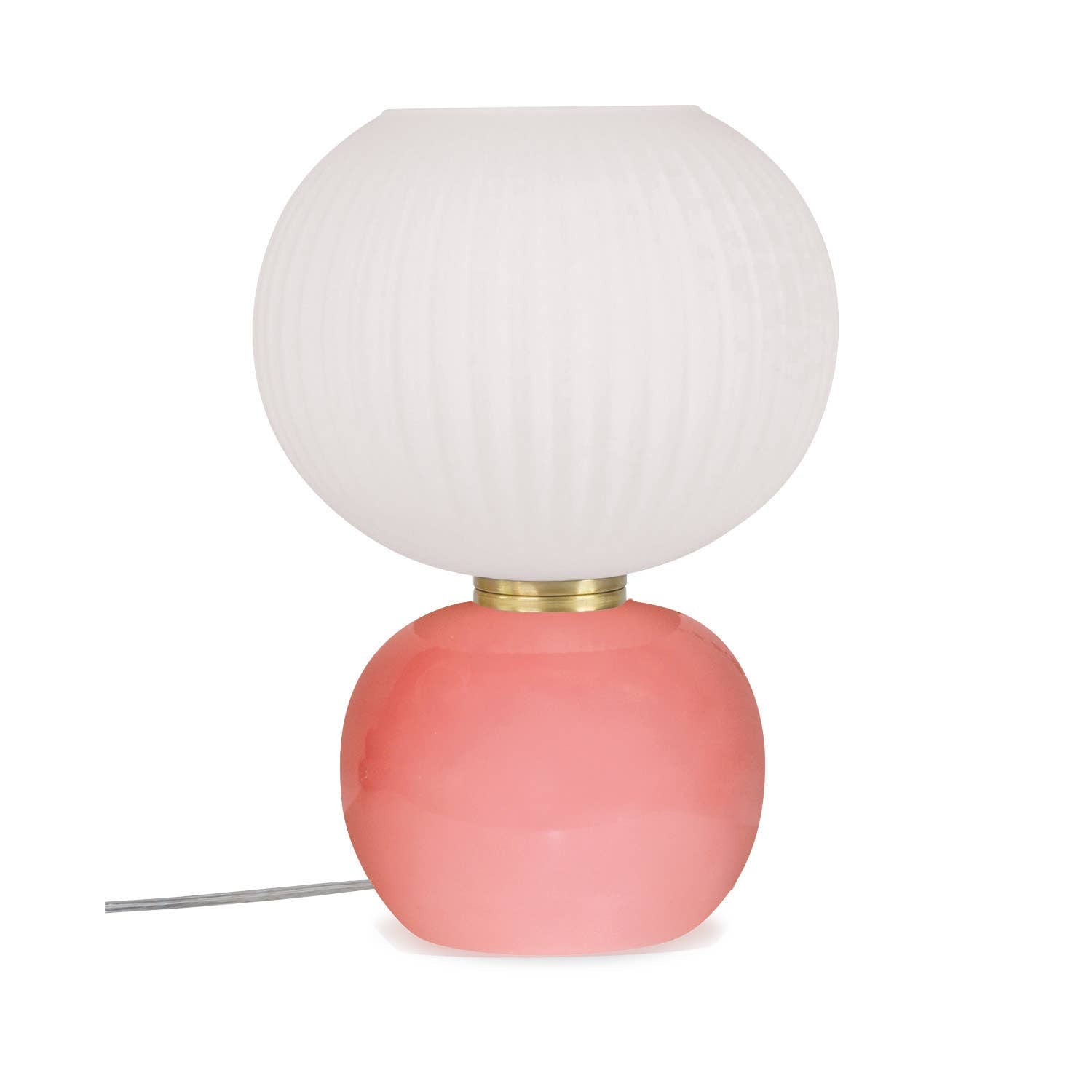 Denne dekorative bordlampen er ren rosa magi ✨ Den skinnende glassfoten i rosa kombinert med en matt, hvit stripet glasskjerm gir et uttrykk som både er elegant, leken og akkurat passe retro.