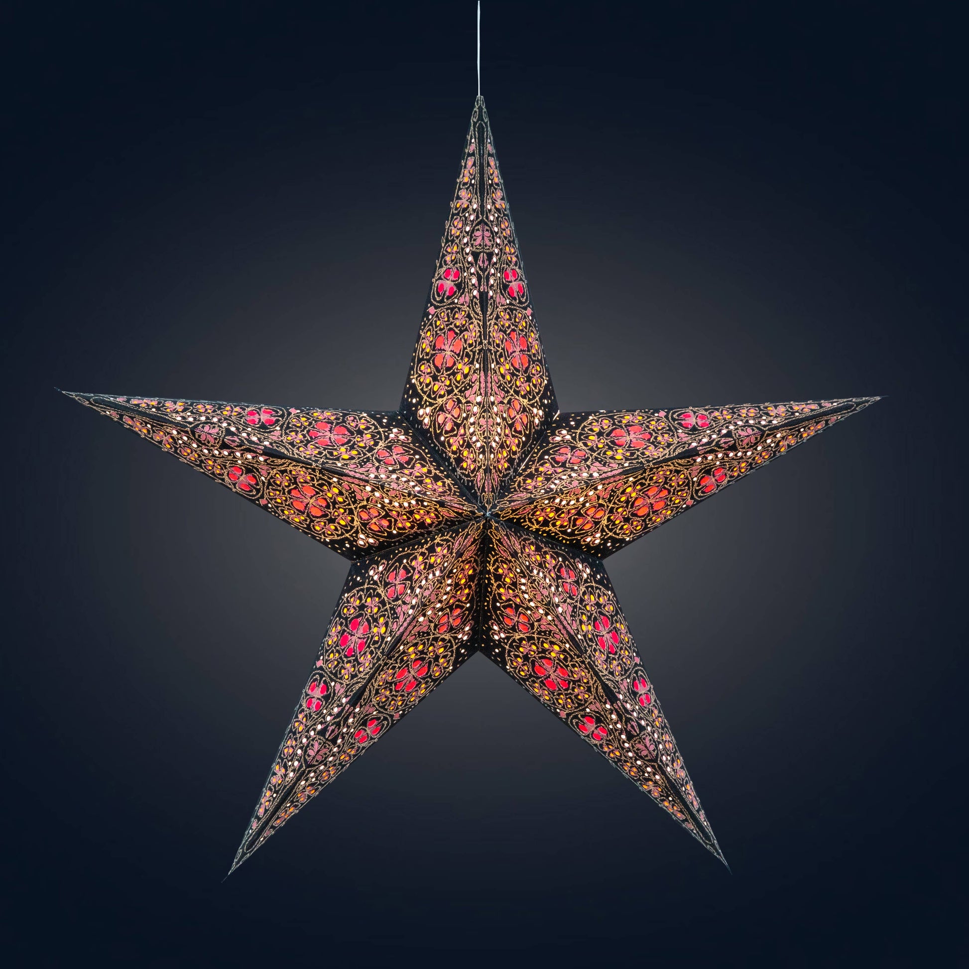 Denne håndlagde papirstjernen i svart og rosa har rød og oransje silkepapir som gir et varmt og glødende uttrykk. Det detaljerte silketrykte mønsteret og fargeinnlegget gir stjernen et utseende som minner om glassmalerier og rosevinduer – perfekt som dekor til høytid, fest eller som gave.