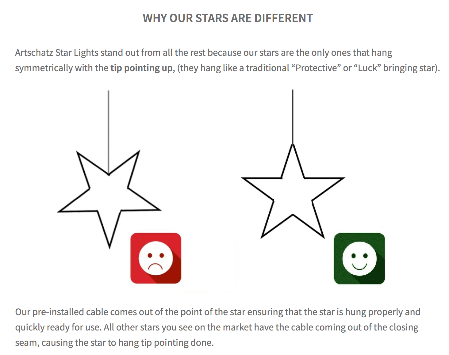 Ferdigmontert, gjennomsiktig kabel som gĂ„r ut fra toppen â for riktig orientering og rask oppheng. Andre stjerner henger ofte skjevt fra siden.