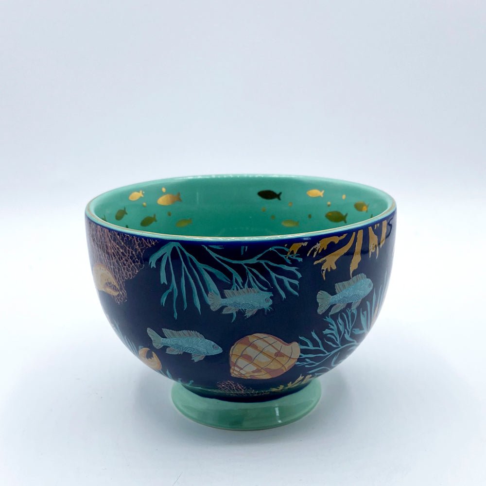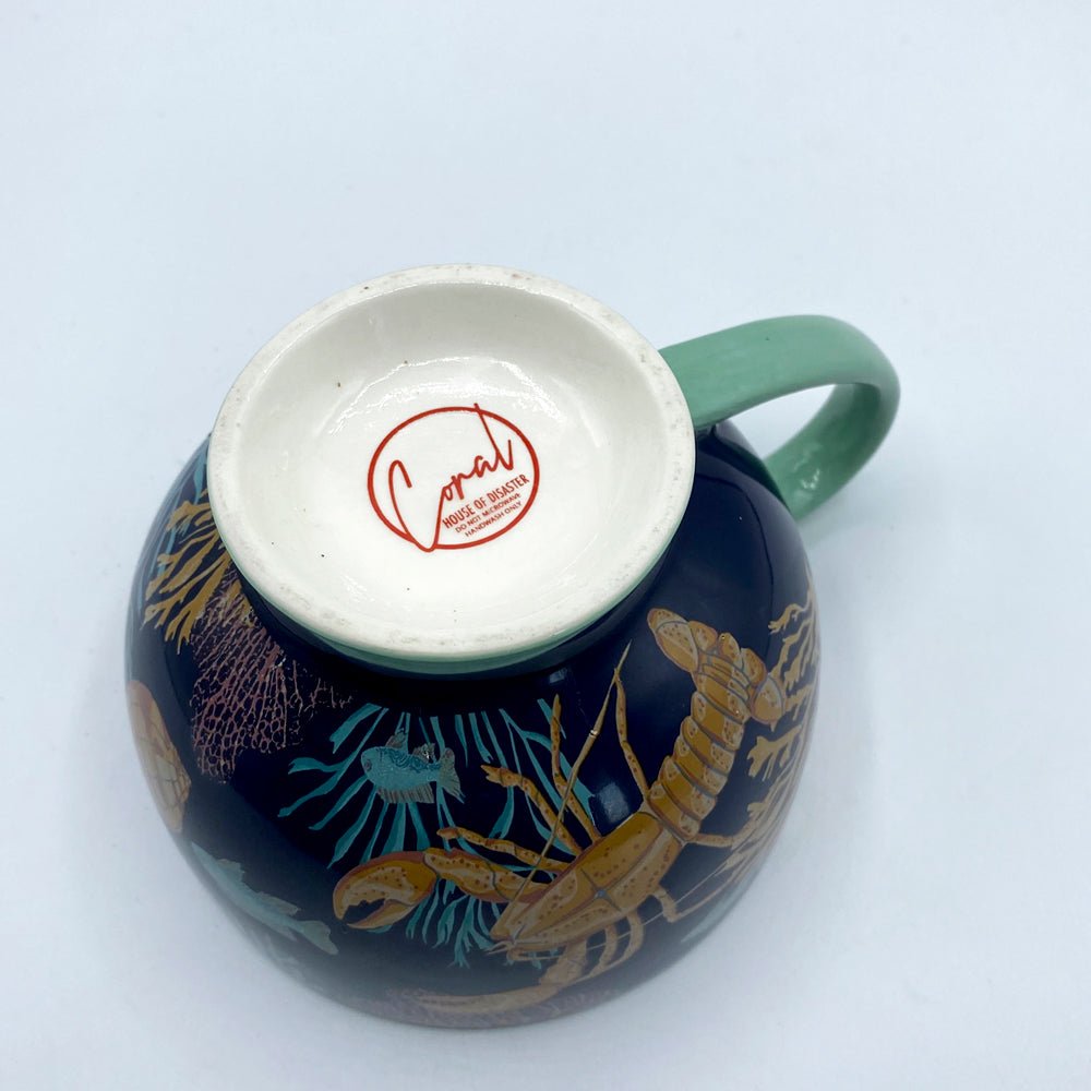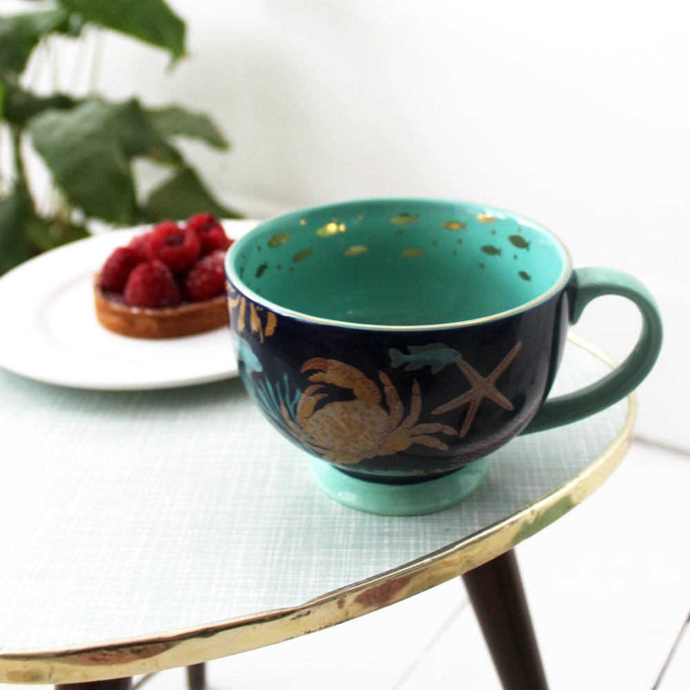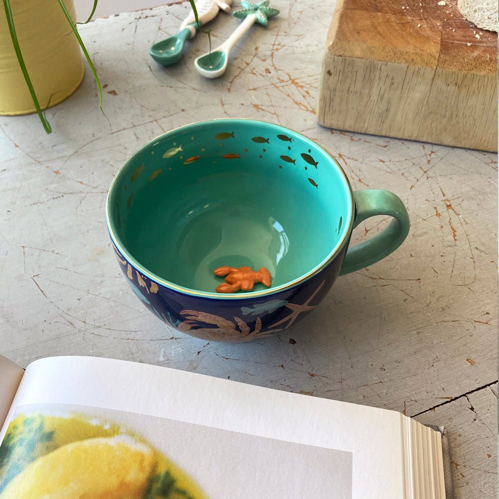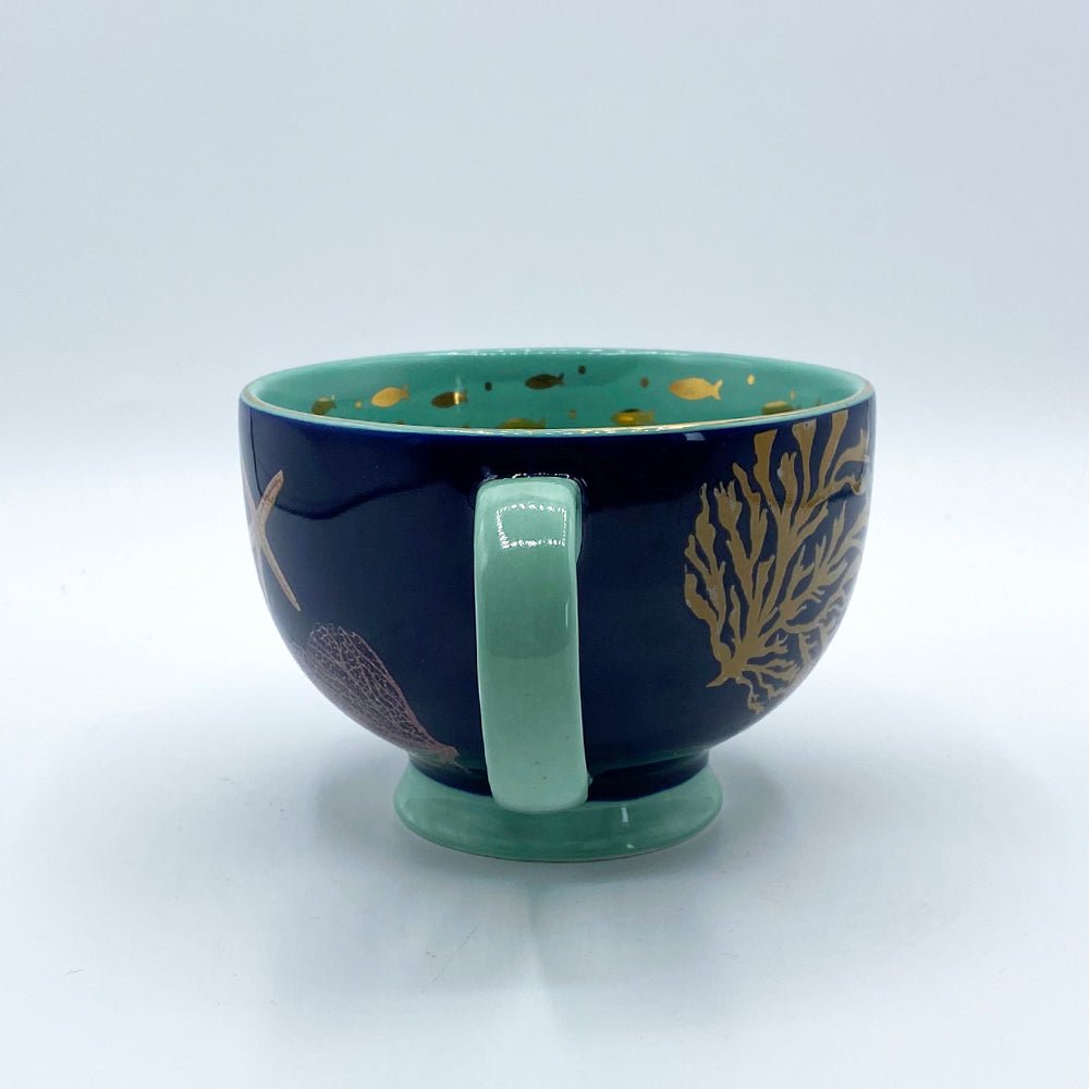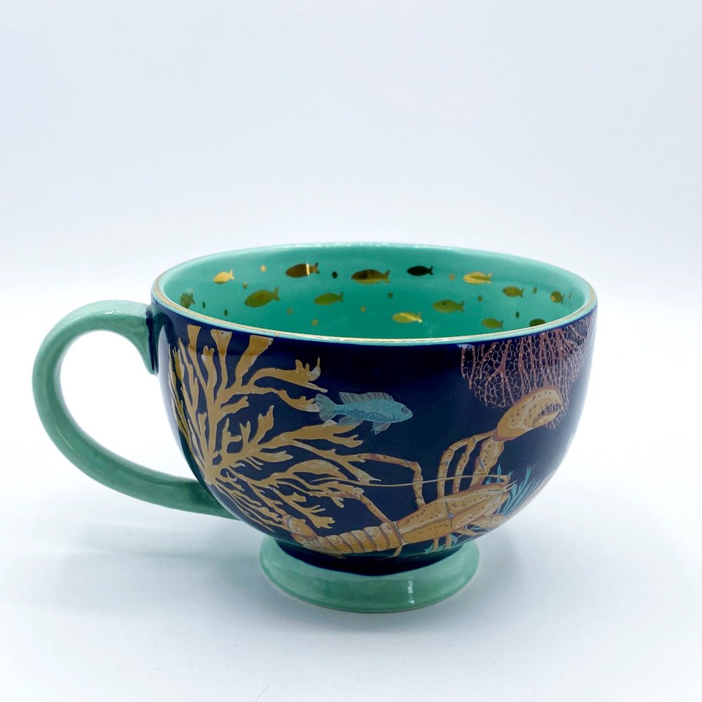 Denne store tekoppen er en ekte samtalestarter. På innsiden sitter en sjarmerende keramisk hummer og venter på å bli oppdaget, omgitt av en dyp turkis glasur og små gullfisker som svømmer rundt. Utsiden byr på et fargerikt havlandskap med luksuriøse gullkanter – som gjør hver slurk til en liten ferie ved kysten.