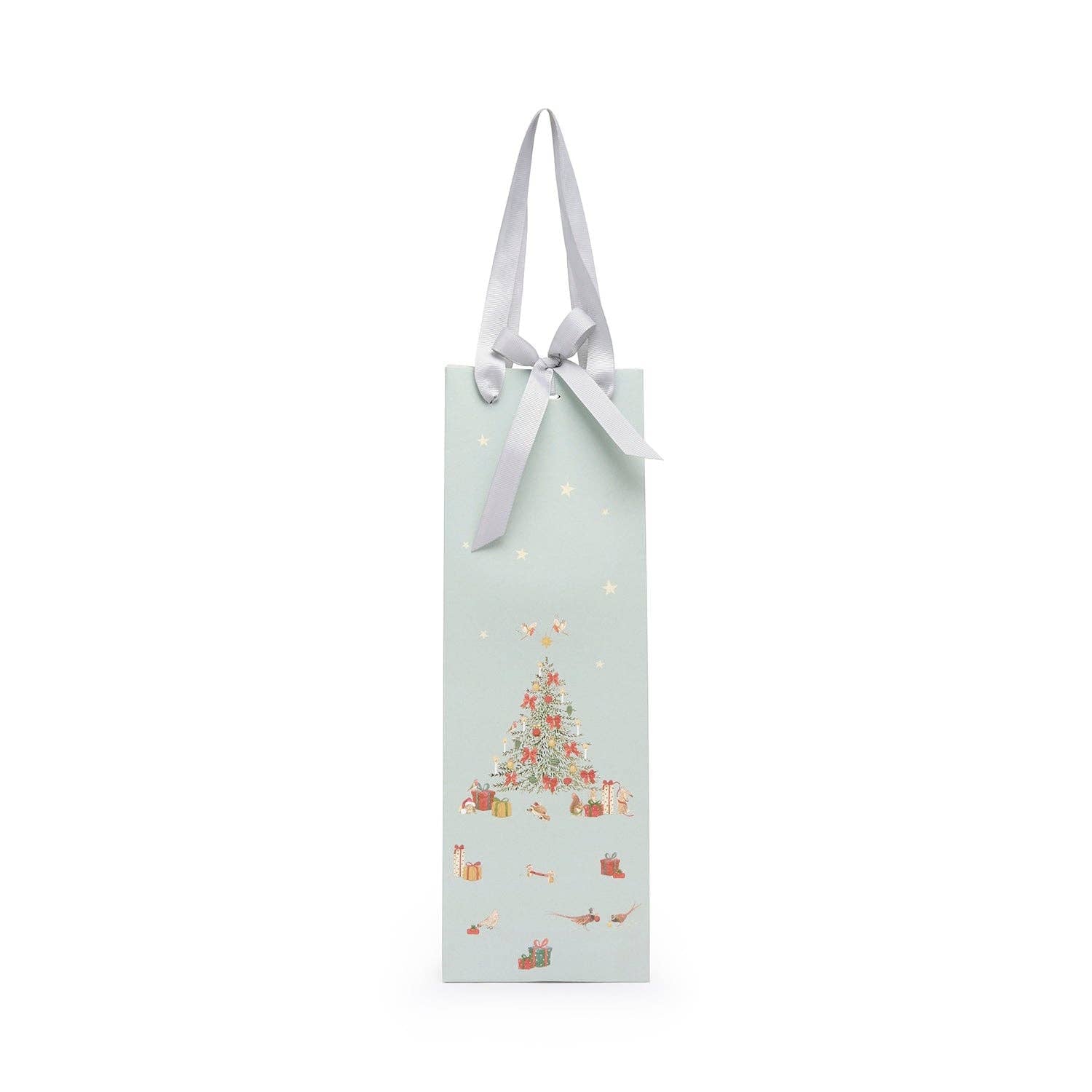 Gi din favoritt-juledrikk en stilfull innpakning med denne sjarmerende flaskeposen, dekorert med Sophies illustrasjon av juletreet – pyntet med glitrende stjerner og spredte gaver. Den støvblå bakgrunnen gir en perfekt ramme for det delikate og detaljerte festmotivet, mens matchende silkebånd som håndtak og sløyfe gir en luksuriøs finish.