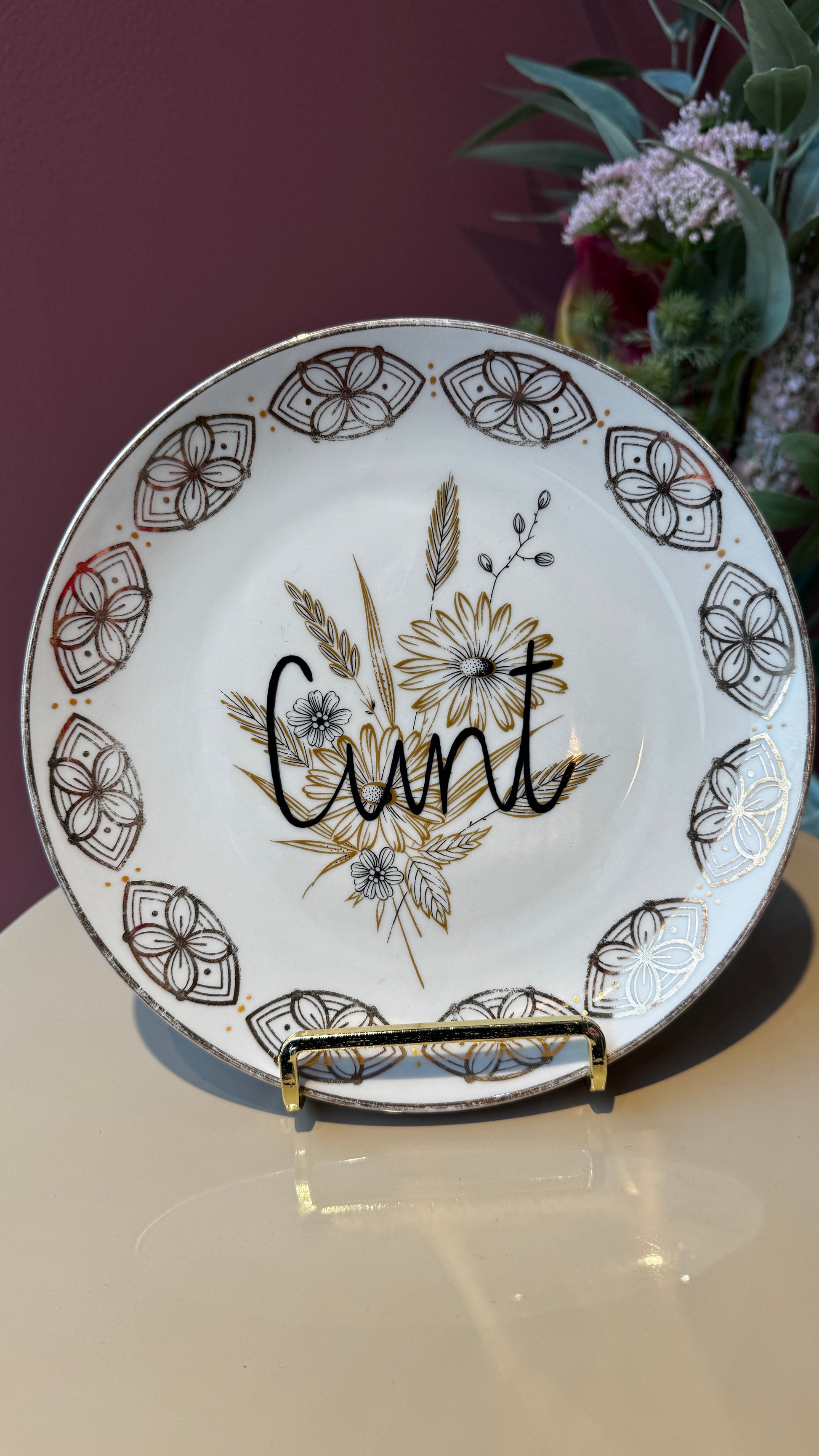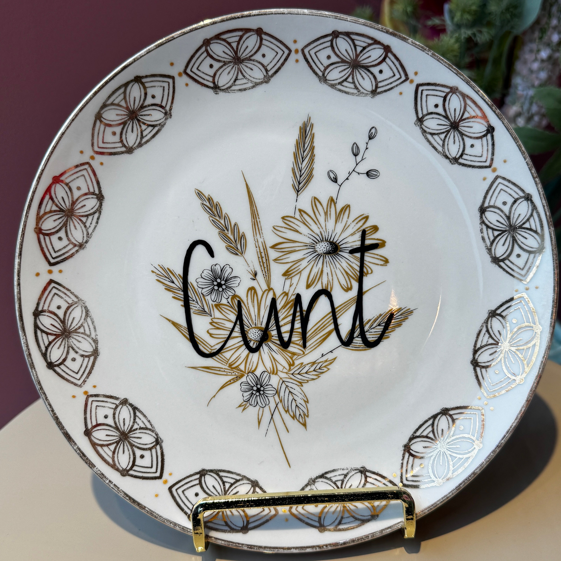 Frekk og dekorativ tallerken med humoristisk vri.