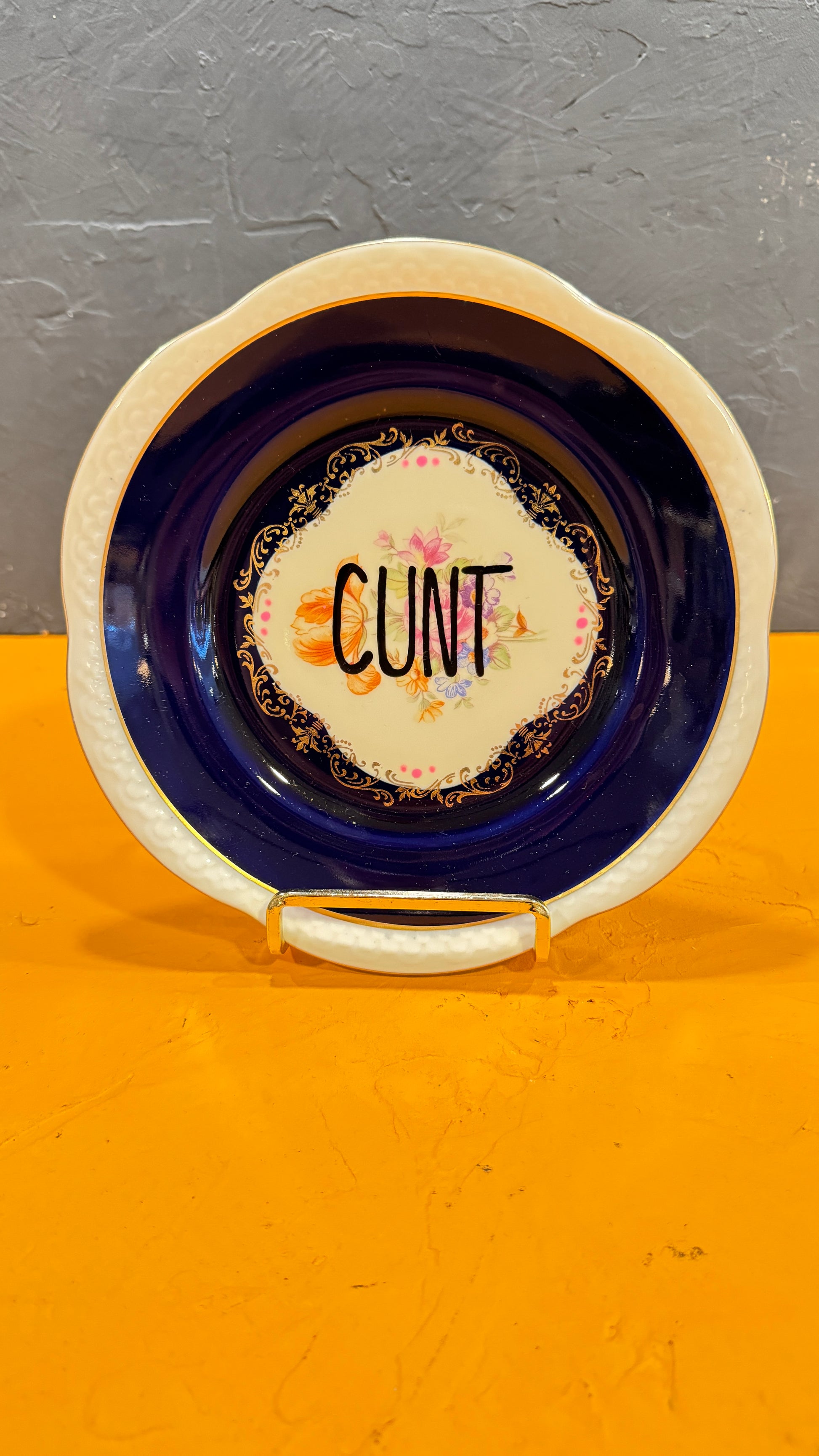 Tekst i porselensmaling, på retro tallerkener funnet på loppemarked i Europa.