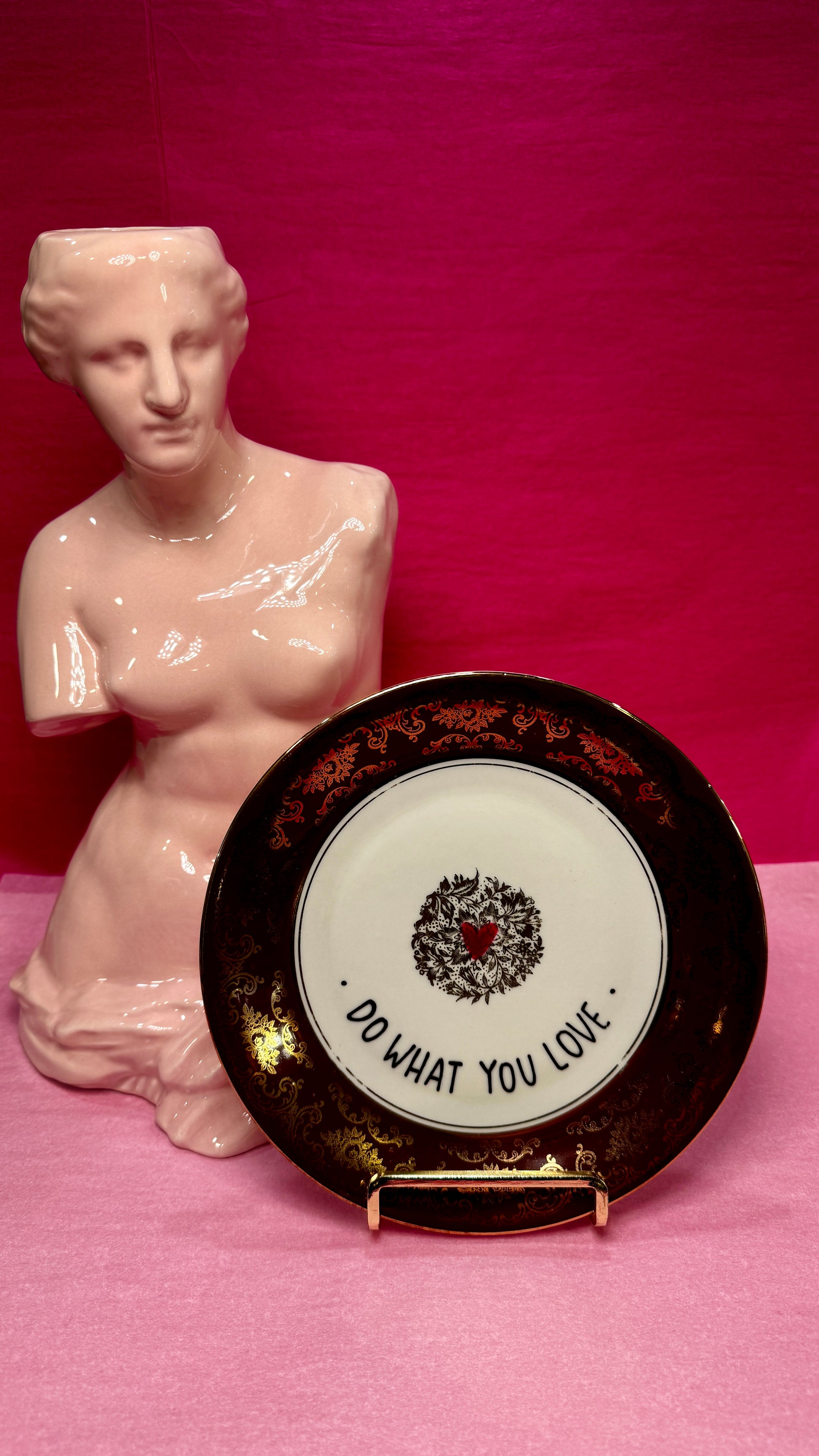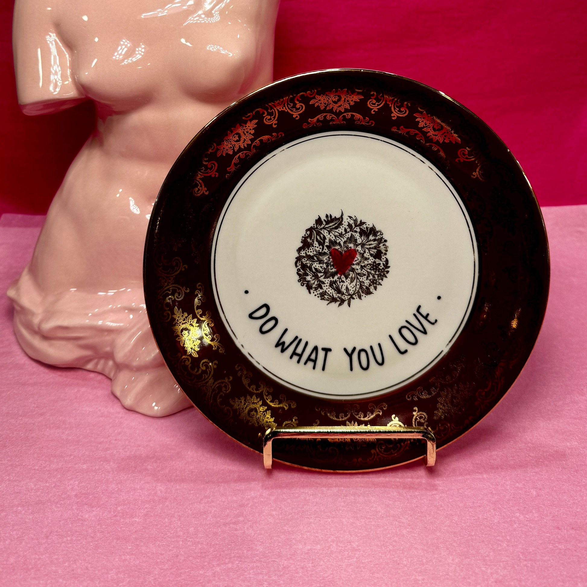 Tekst i porselensmaling, på retro tallerkener funnet på loppemarked i Europa.