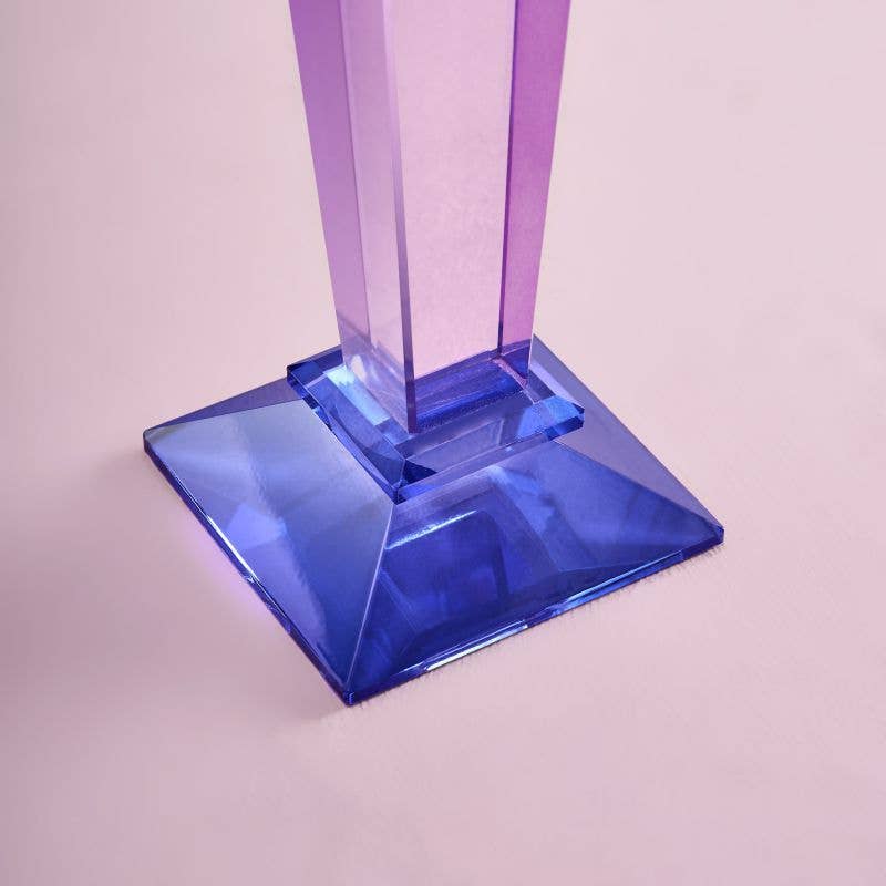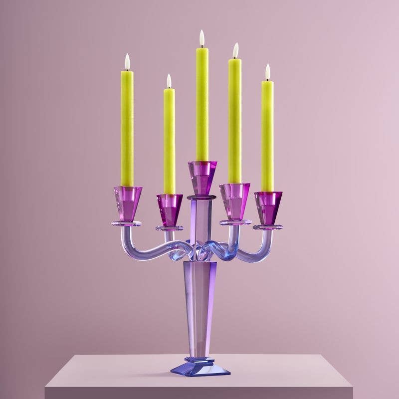 Fancy Crystal Candelabra i lilla er som en glamorøs tante du aldri helt vet hva kommer til å skje med – men du vet det blir ikonisk. Med sine 40 cm i høyden og fem armer som roper «mer lys, mer drama, mer alt», er dette ikke en lysestake. Det er et statement. Et glasskunstverk som nekter å være beskjedent, og som reflekterer lys på en måte som får hele rommet til å se litt mer luksuriøst ut enn det egentlig er.