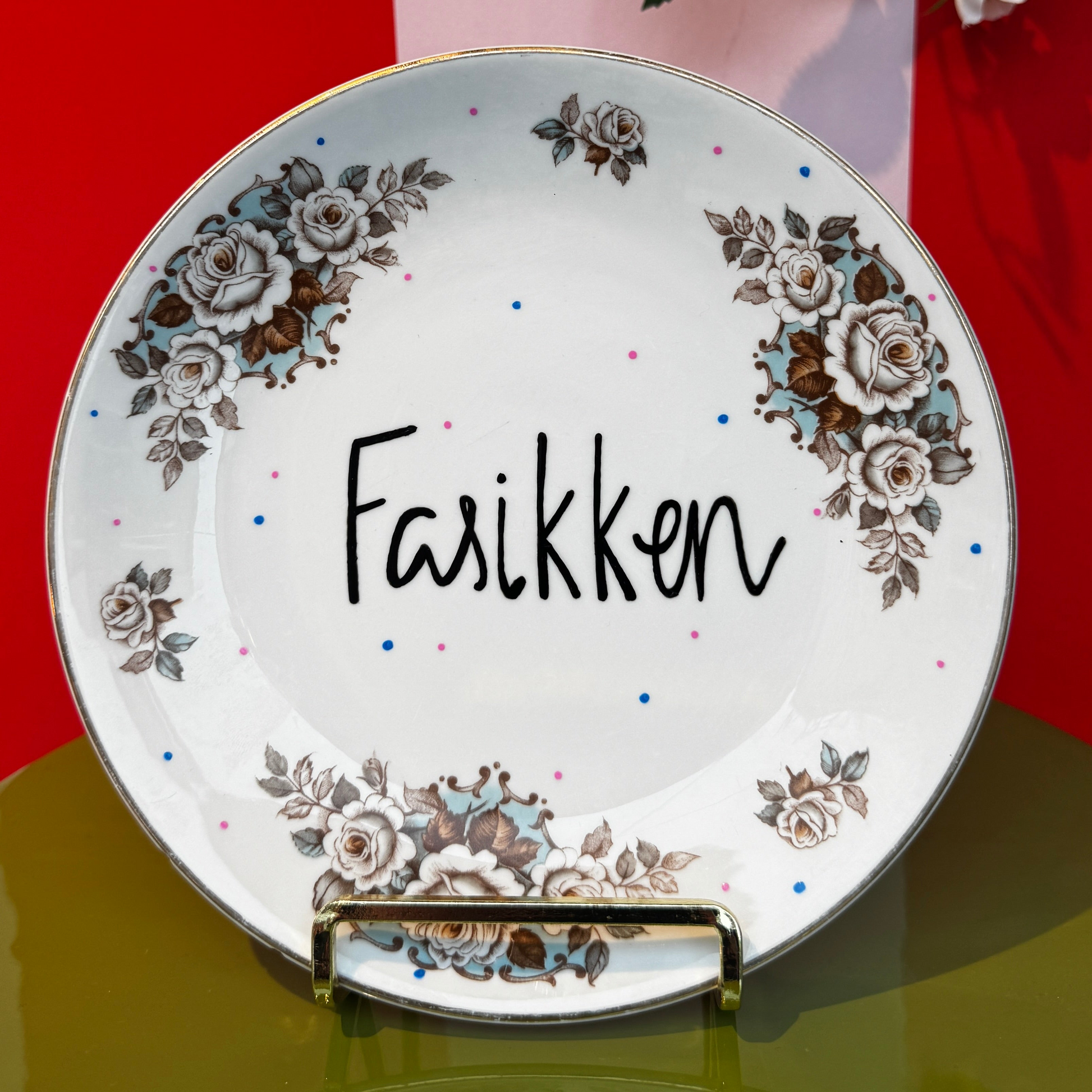 Tekst i porselensmaling, på retro tallerkener funnet på loppemarked i Europa.