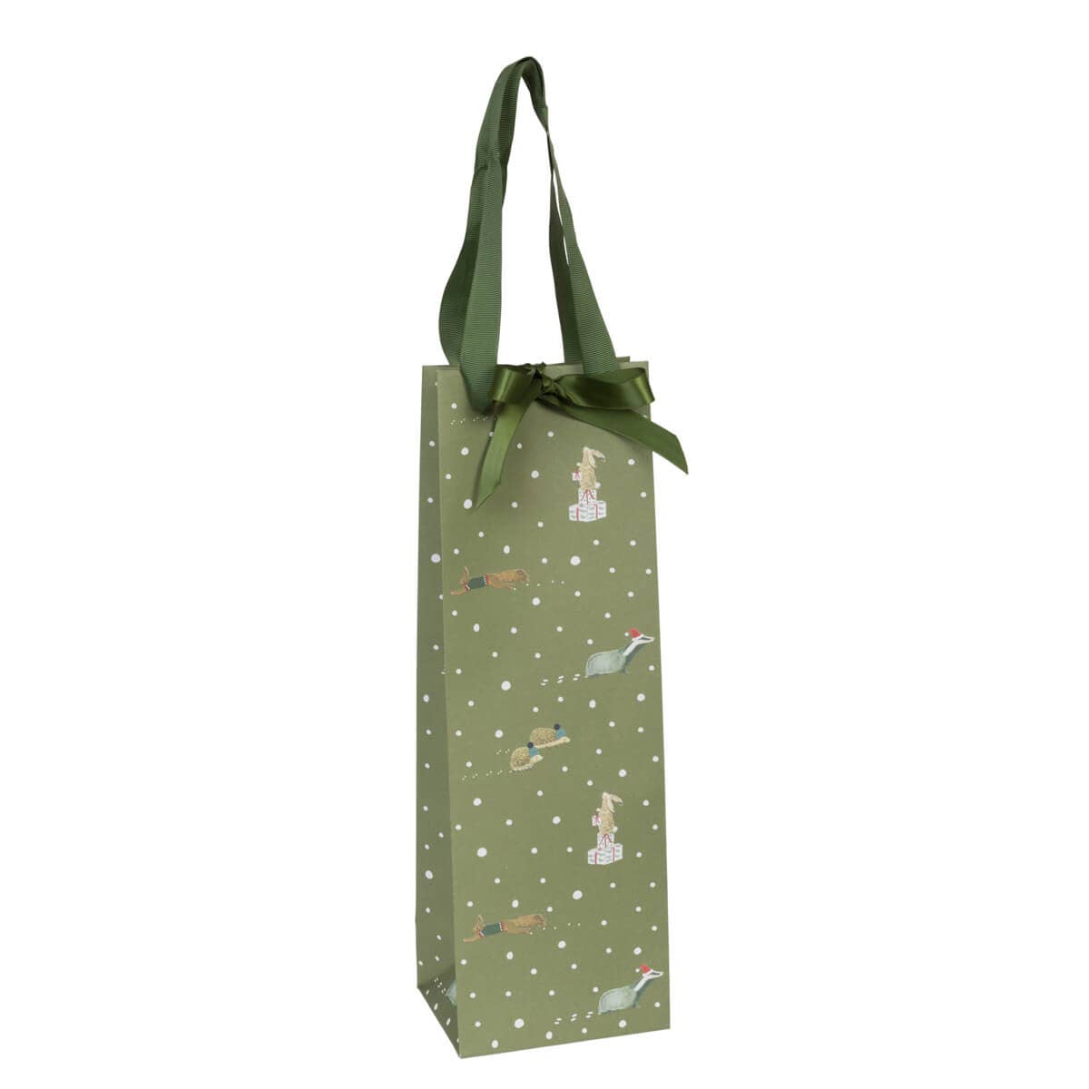 Denne festlige flaskeposen er perfekt når du skal gi bort vin eller bobler med stil. Dekorert med små pinnsvin, grevlinger, harer og ekorn som leker i en snødekt julete skog – alt på en rik olivengrønn bakgrunn. Et hjertevarmt design som garantert får frem smilet hos mottakeren.
