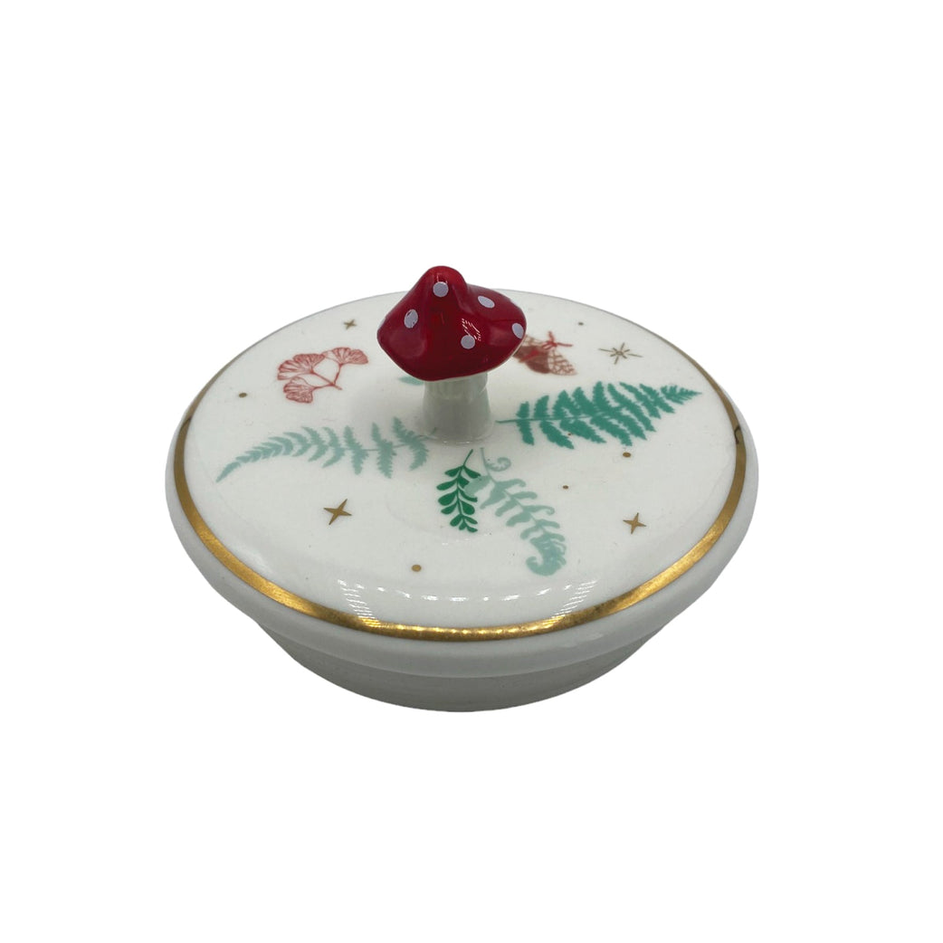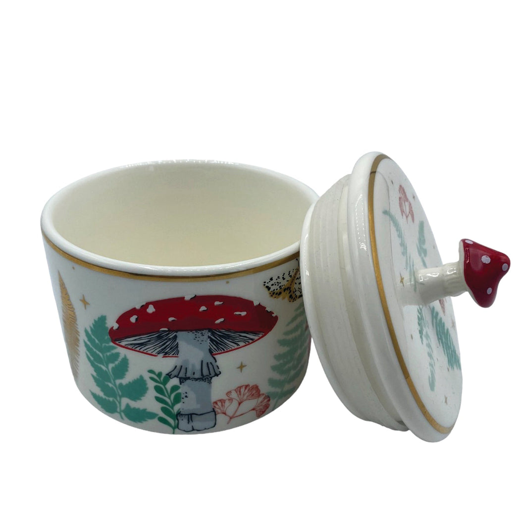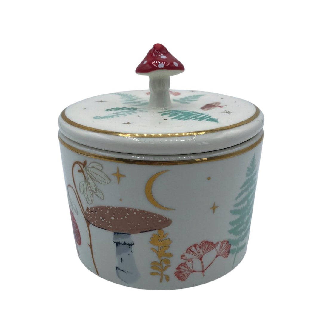Denne nydelige oppbevaringskrukken bringer skogbunnens magi rett inn på soverommet ditt. Med kremfarget base og et illustrert mønster av sopper og bregner, pyntet med luksuriøse detaljer i gullfolie, er den både praktisk og poetisk.