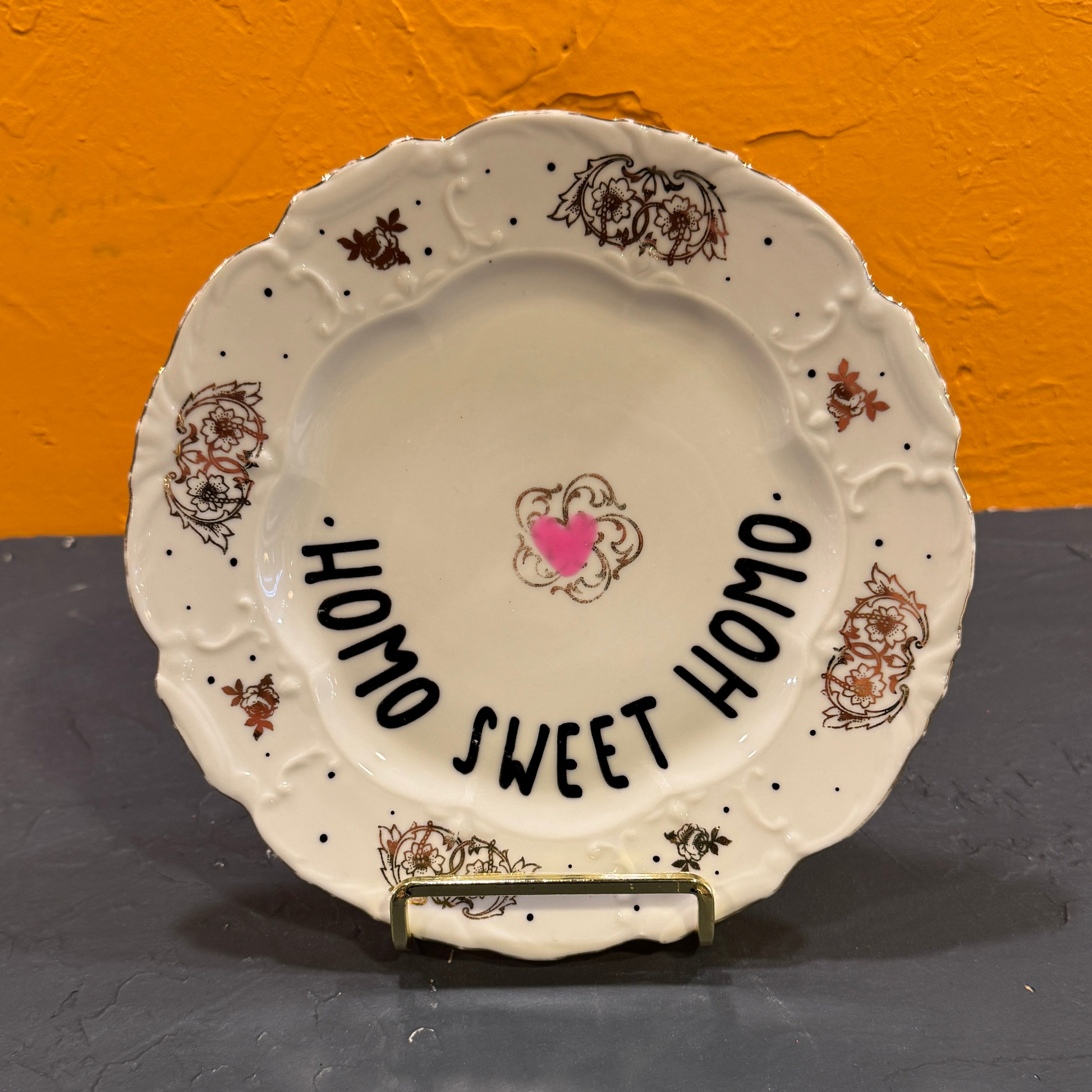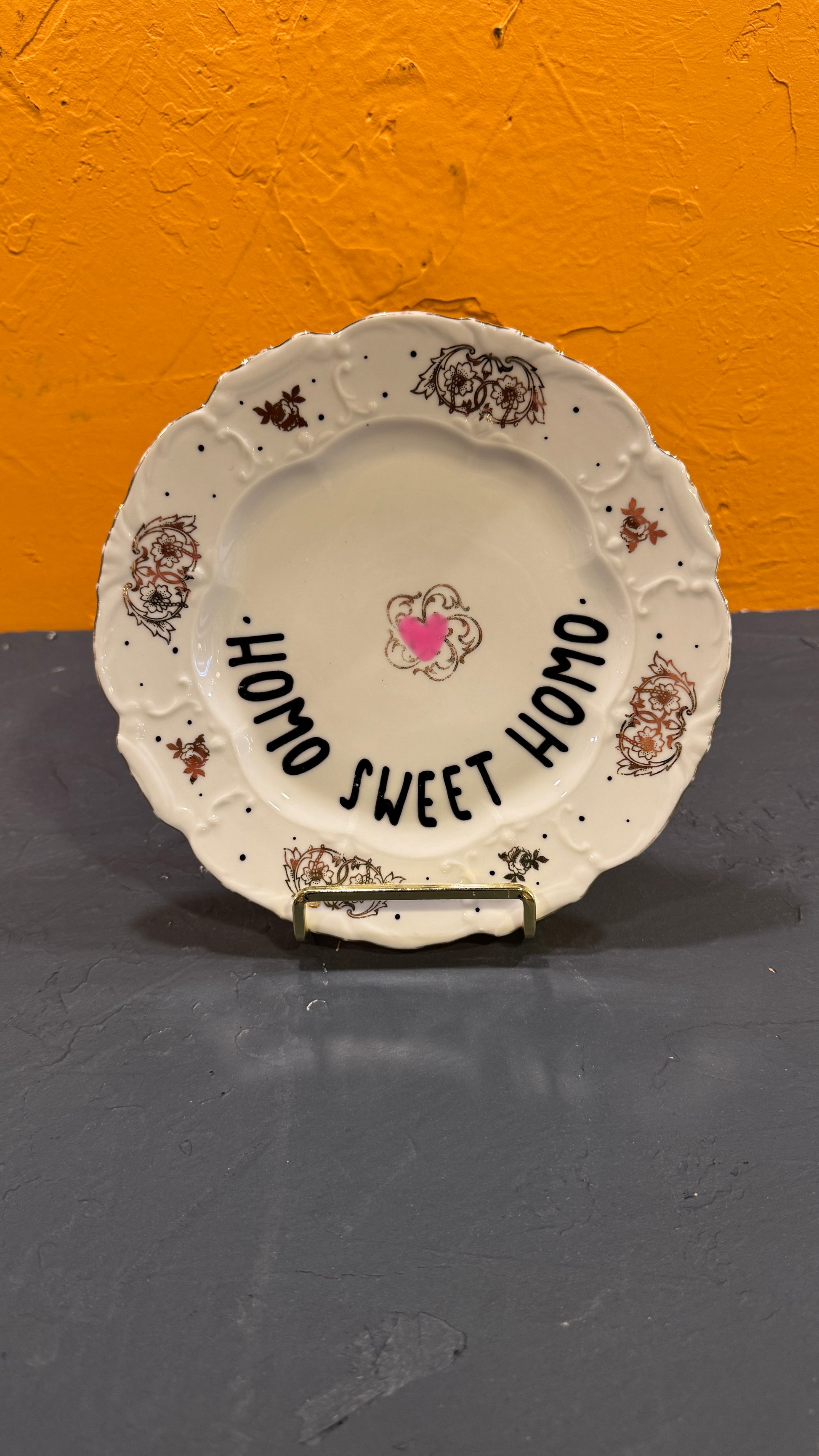 Tekst i porselensmaling, på retro tallerkener funnet på loppemarked i Europa.