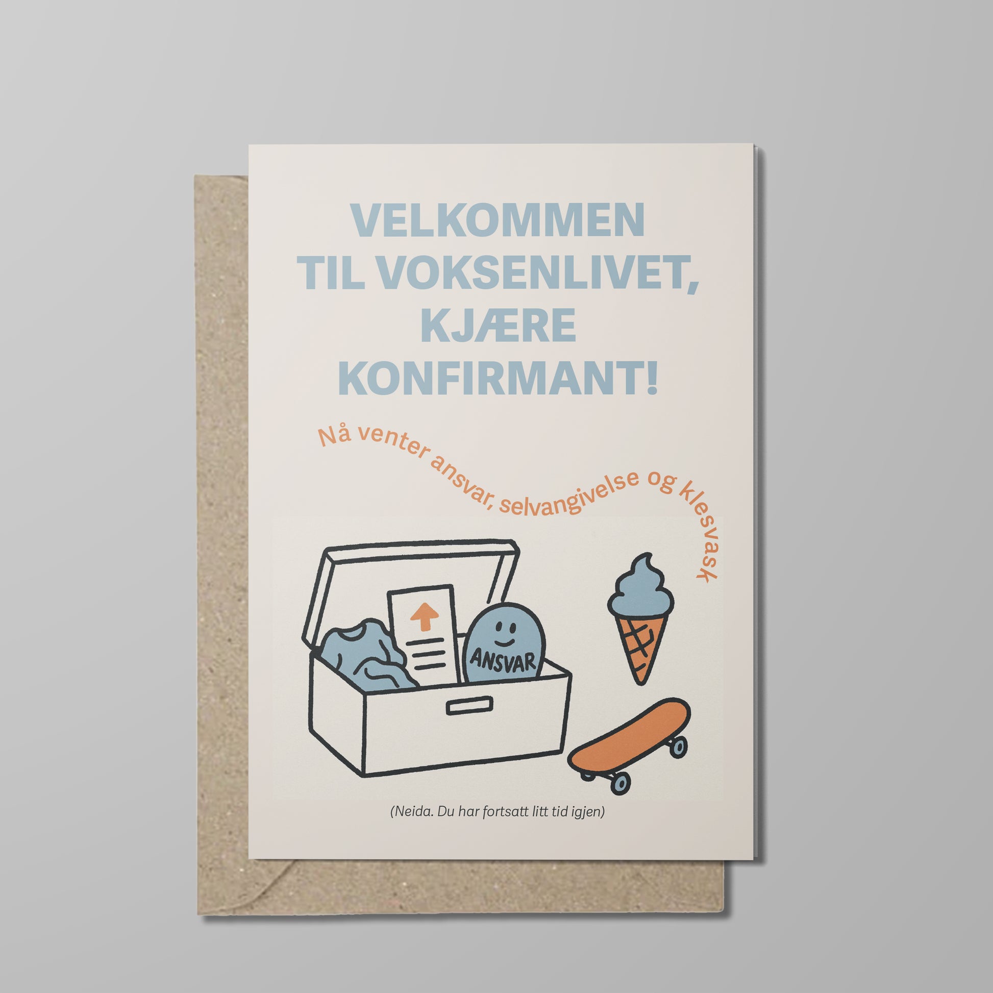 Dobbelt kort i størrelse A6, med fire sider og konvolutt i farge. Kortene er designet av TWAS og produsert i Stavanger.