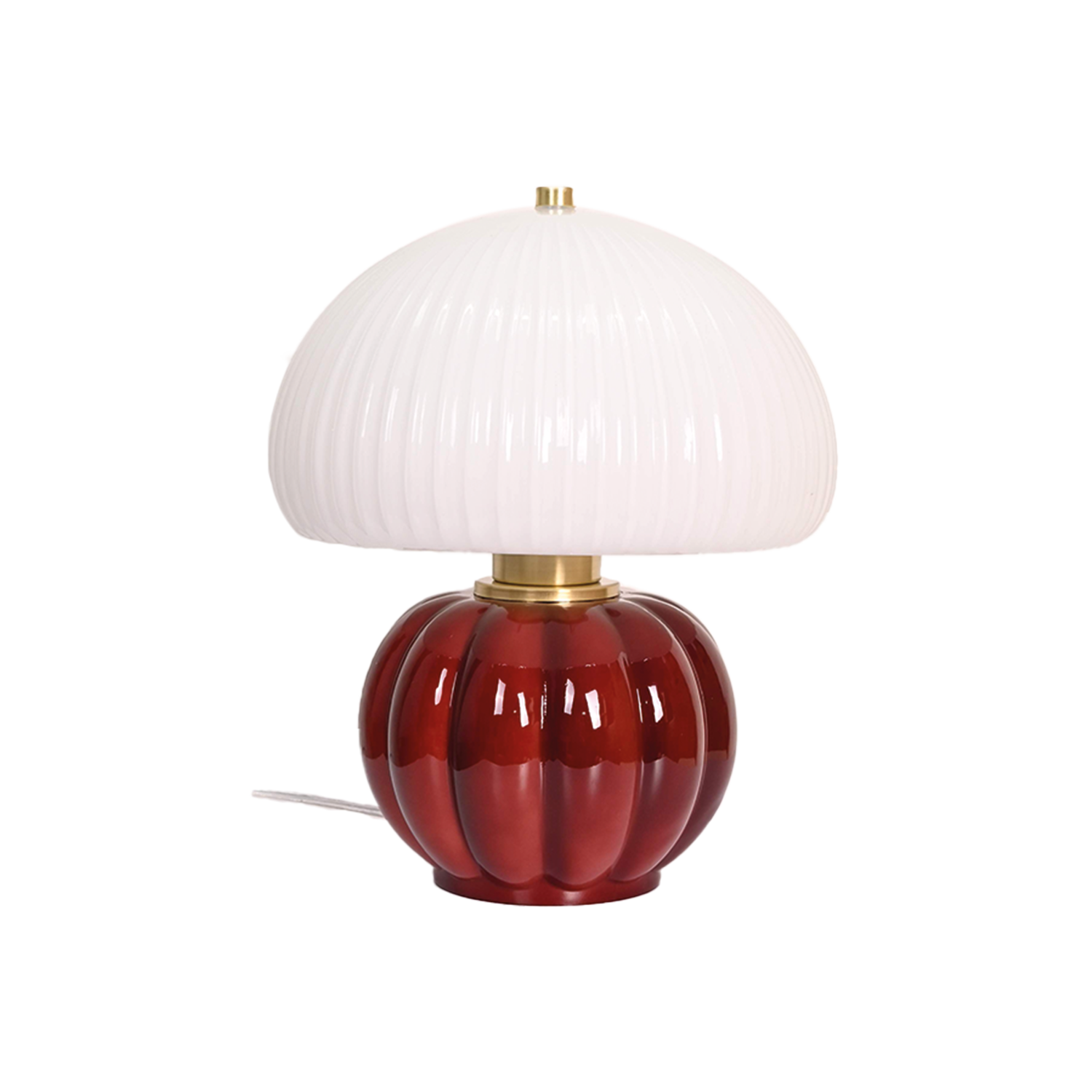 Denne bordlampen kombinerer glass, glød og en dyp burgundertone som gir rommet umiddelbar varme ✨ Den elegante glassbasen og matchende skjermen gjør lampen til et stilrent blikkfang på skrivebordet, nattbordet eller i stua.