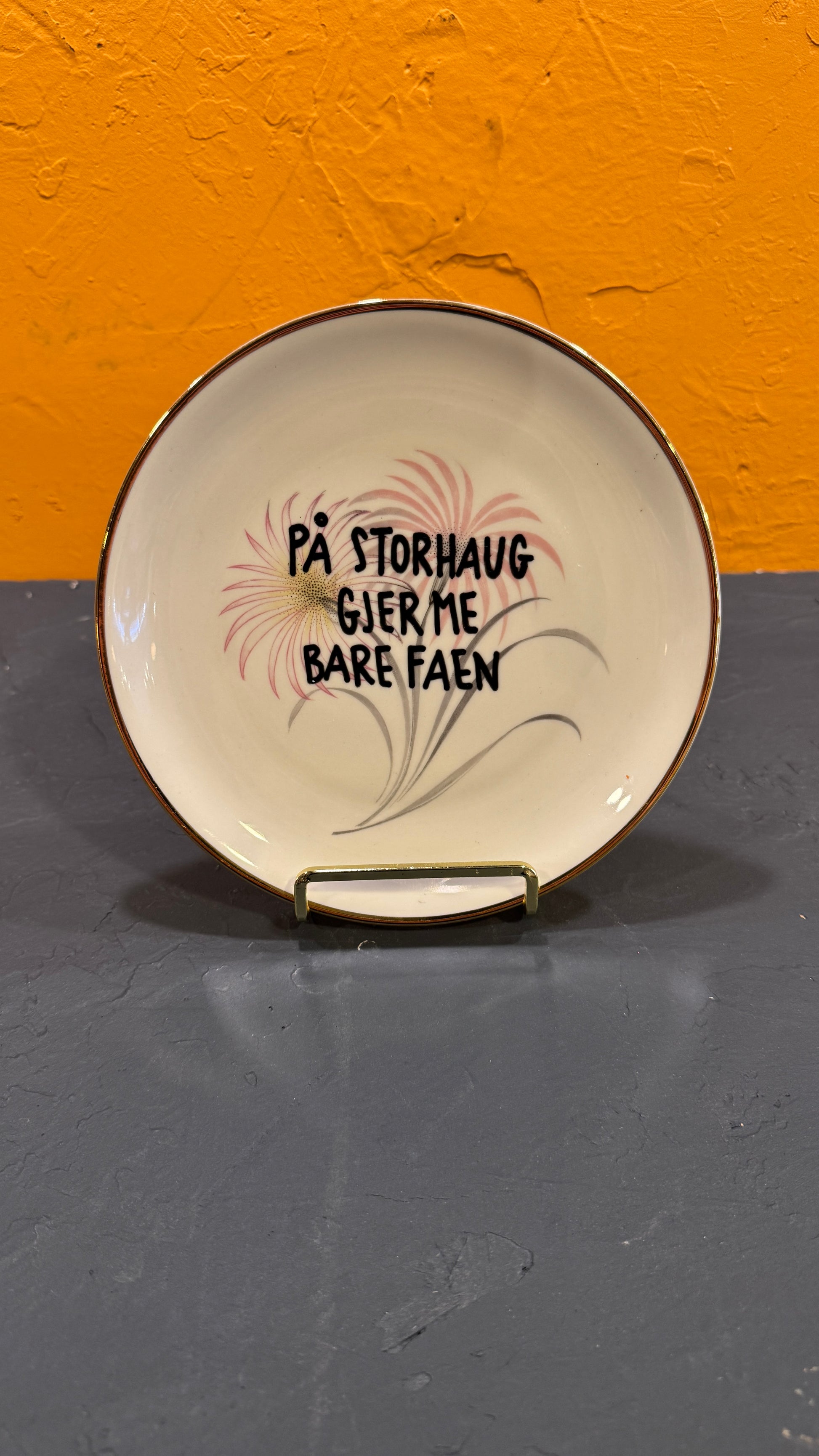 Tekst i porselensmaling, på retro tallerkener funnet på loppemarked i Europa.