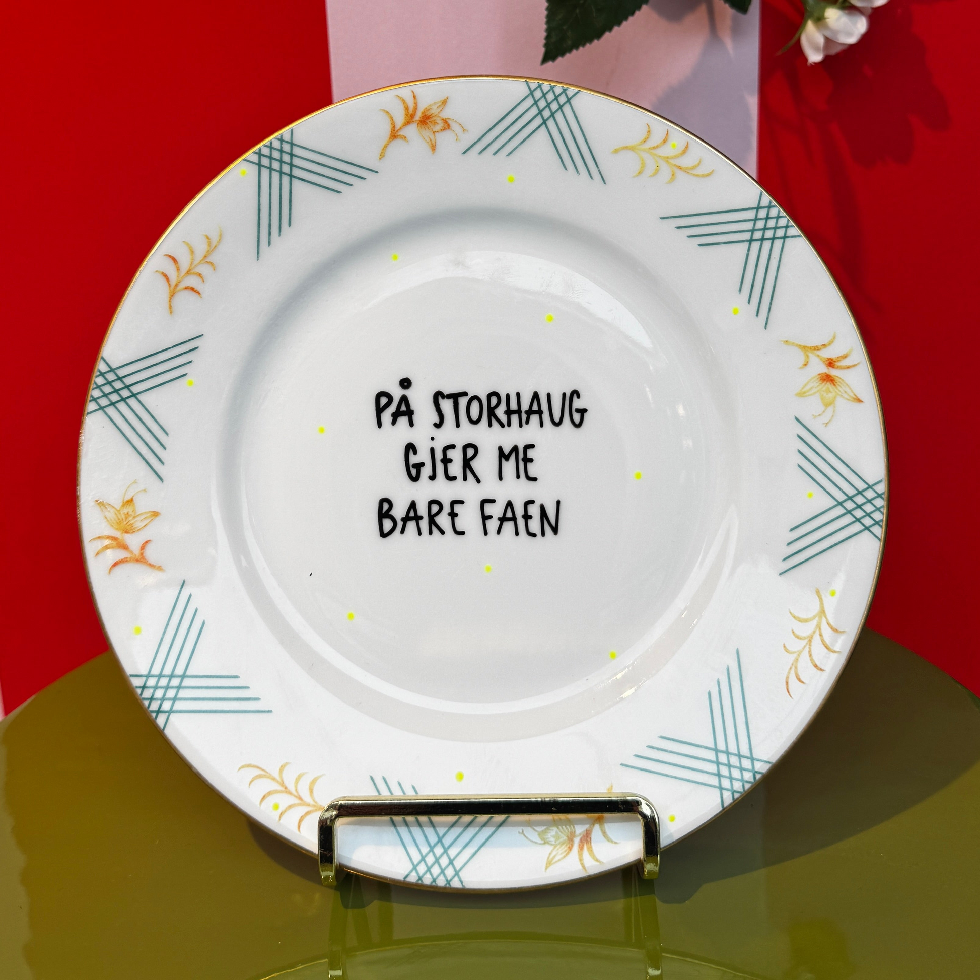 Frekk og dekorativ tallerken med humoristisk vri.