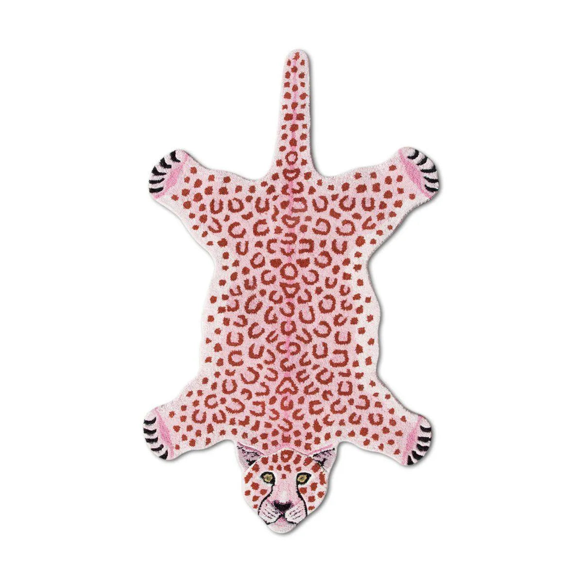 Dette håndlagde, rosa leopardteppet med et vennlig ansikt er den perfekte måten å lyse opp og skape blikkfang i ethvert rom.