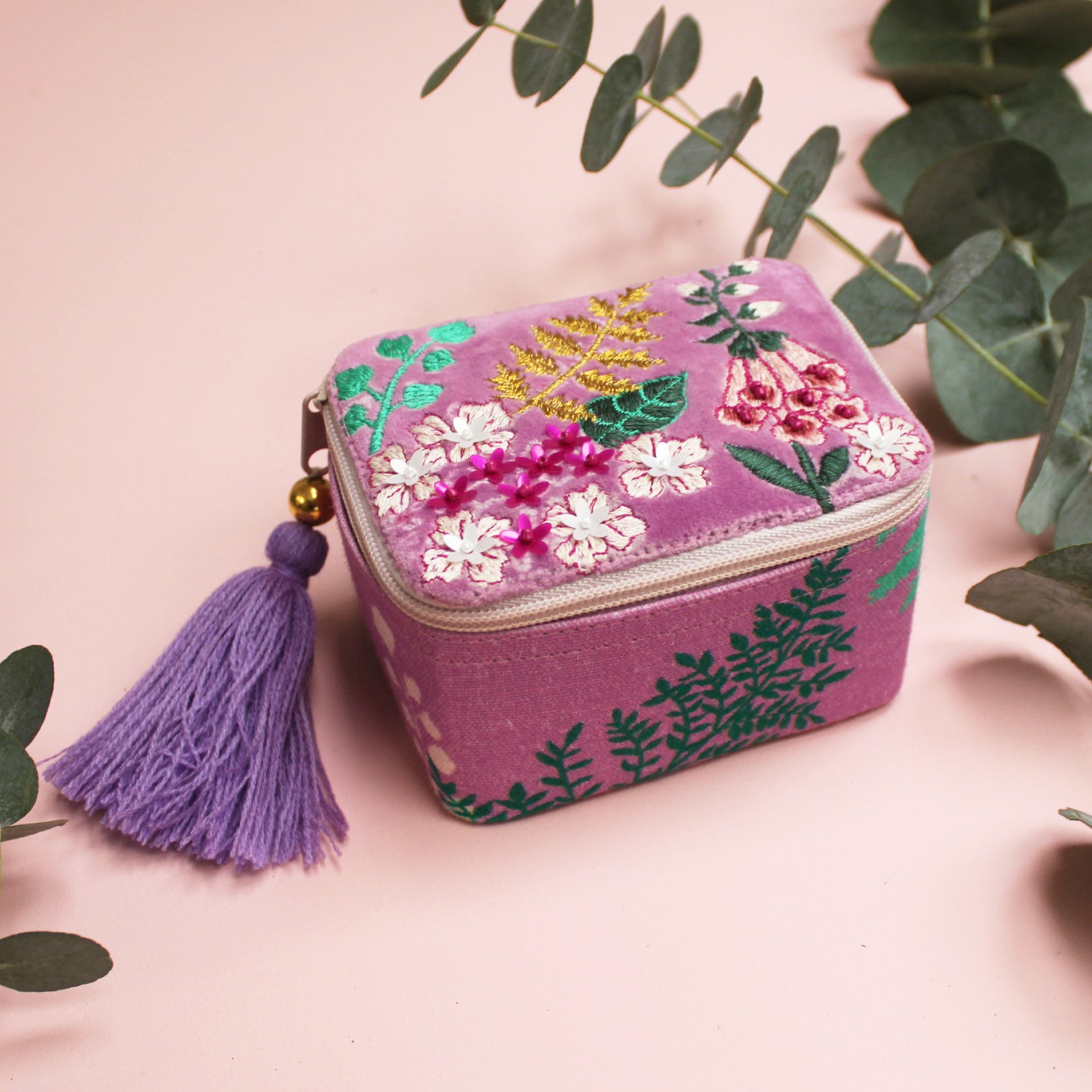 Her er smykkeskrinet som tar reiseaccessoirer til et nytt nivå – nemlig “blomstrende luksus med et hint av eventyr.” Denne lilla skjønnheten fra Posy er myk som en drøm, brodert med et floralt motiv som ser ut som det har rømt fra en botanisk hage, og pyntet med perler, gullbroderi og paljetter som om den har vært på fest hele natten.