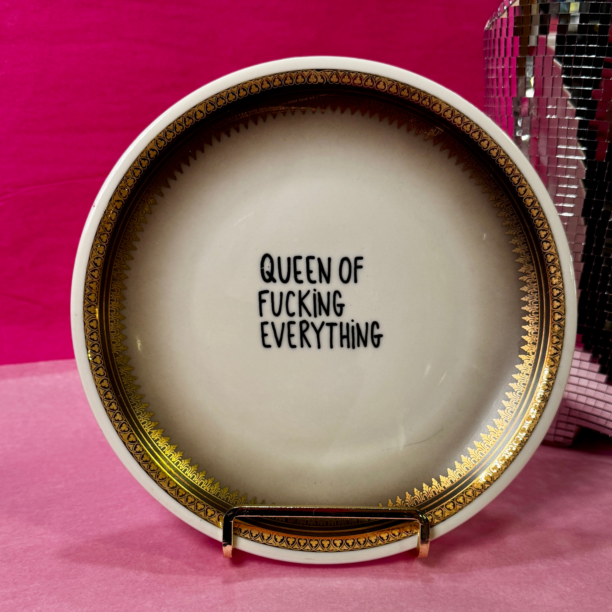 Tekst i porselensmaling, på retro tallerkener funnet på loppemarked i Europa.