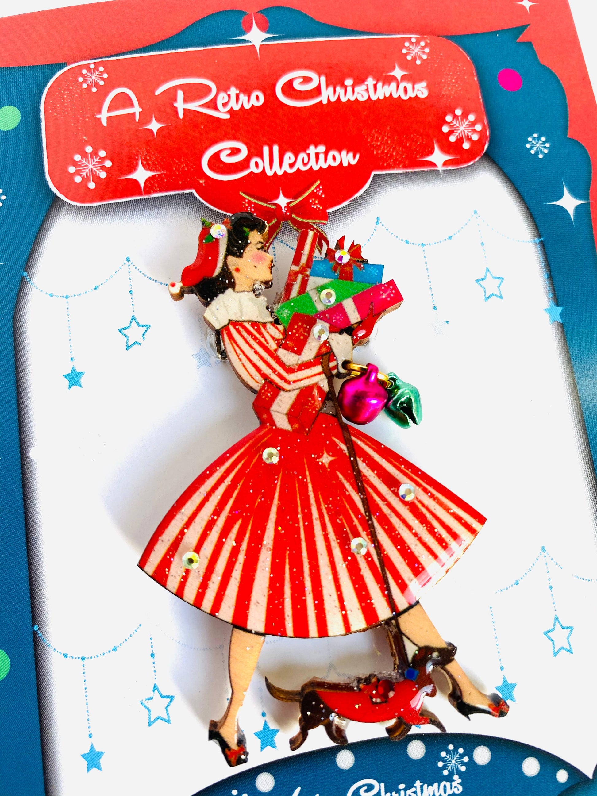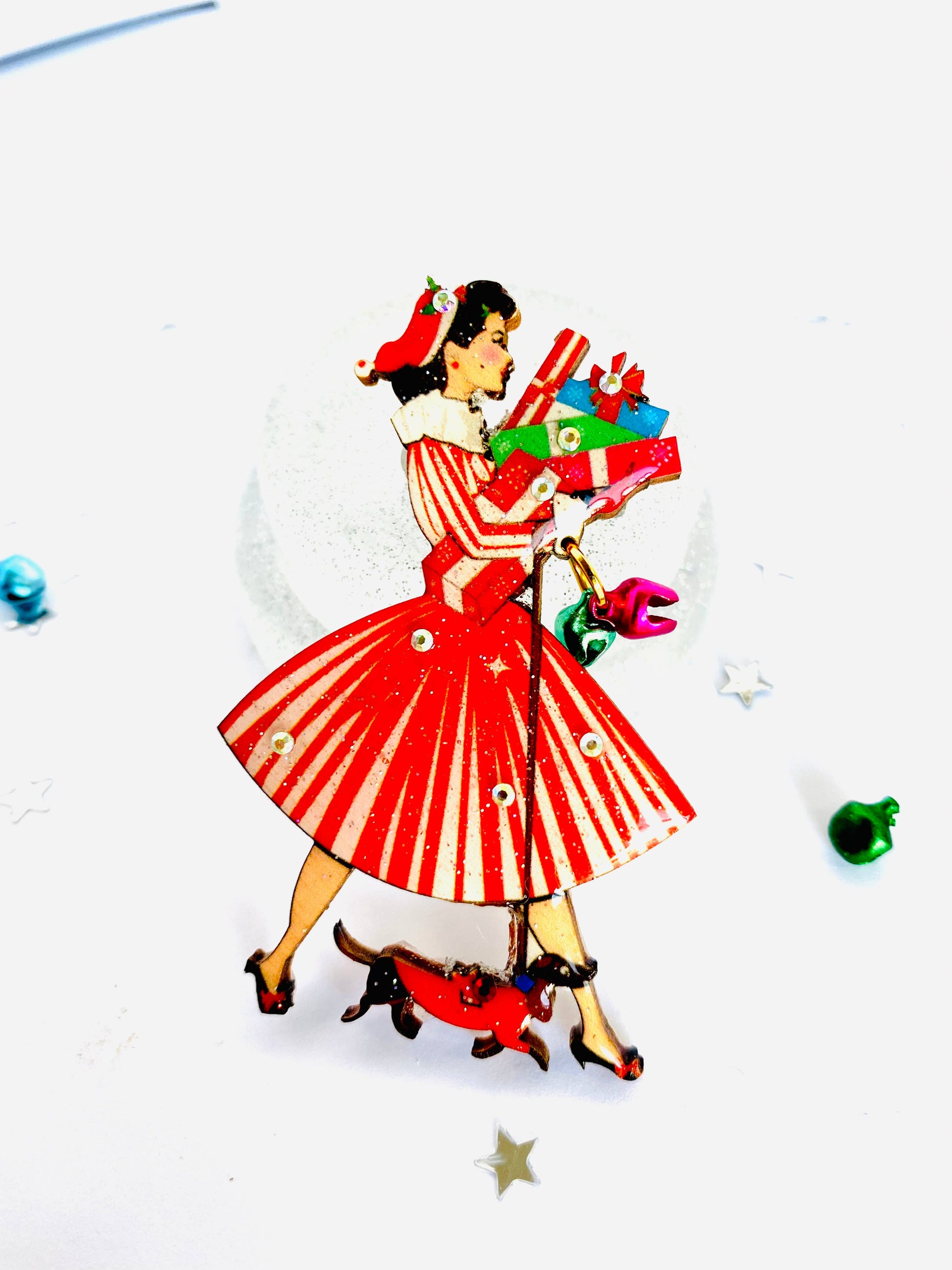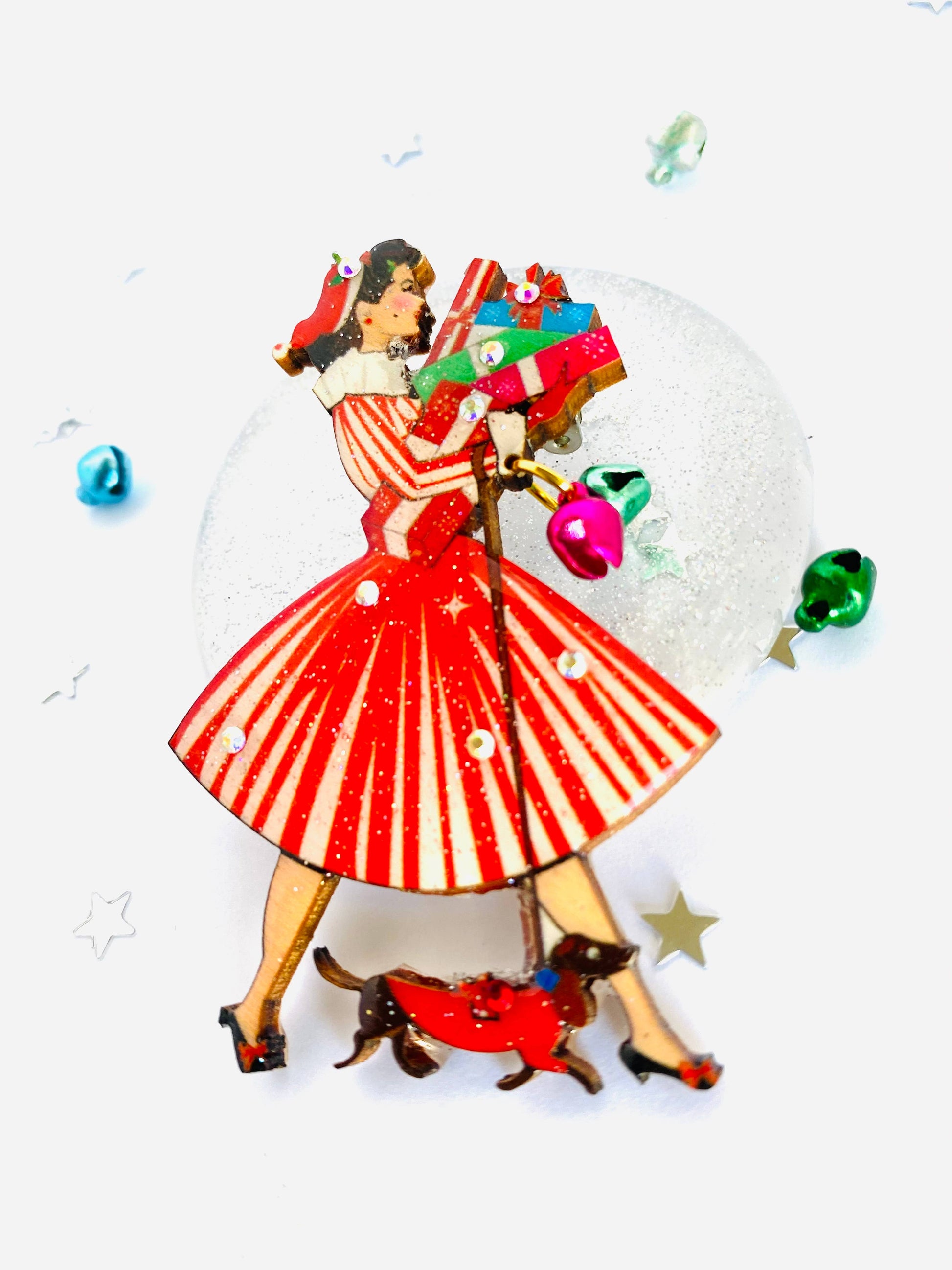 Pen julebrosje fra 1950-tallet med gaver og dachshund. Brossjen består av 3 julebjeller som henger fra håndleddet hennes. En så nydelig festlig 1950-tallsinspirert brosje!
