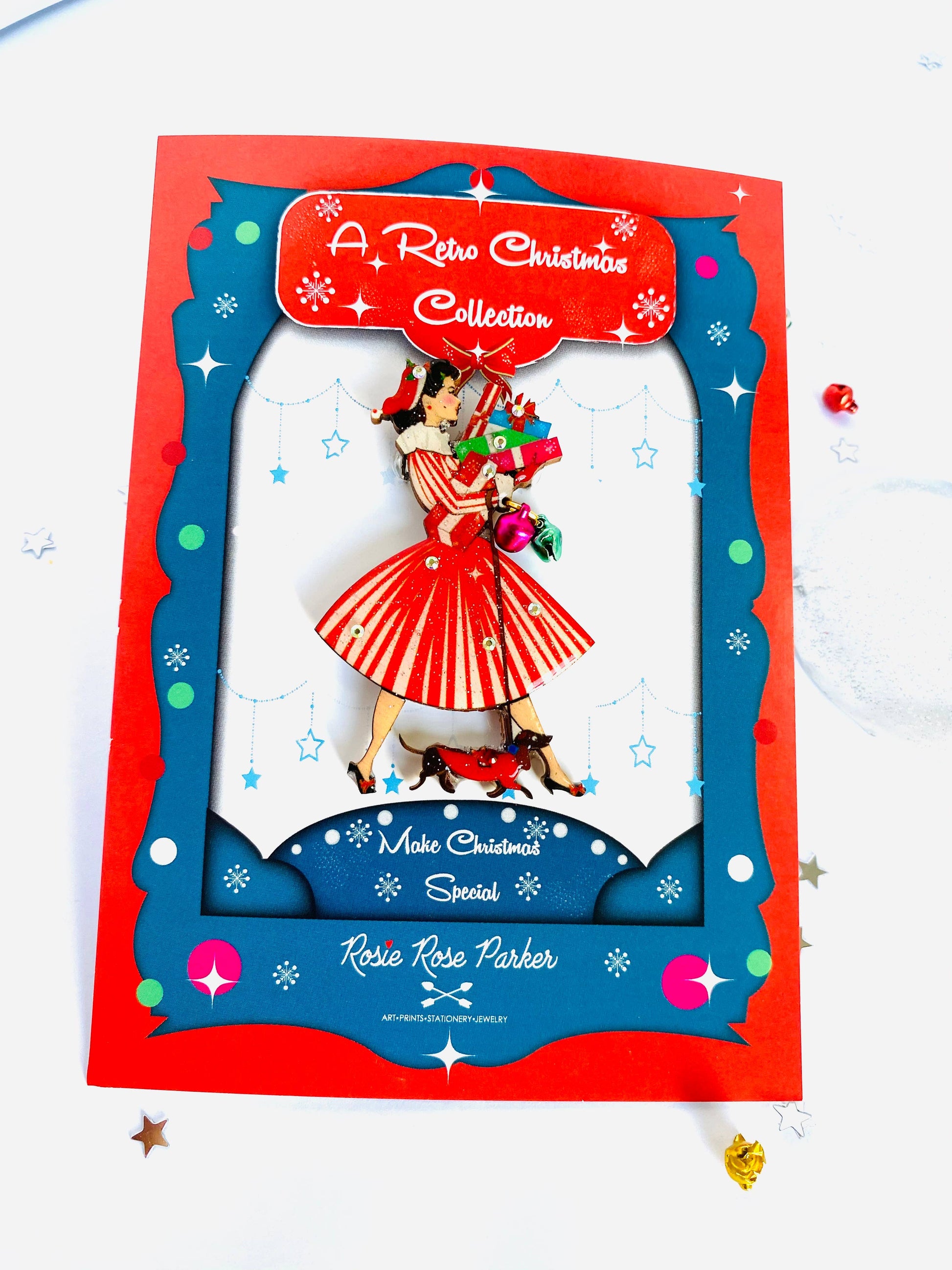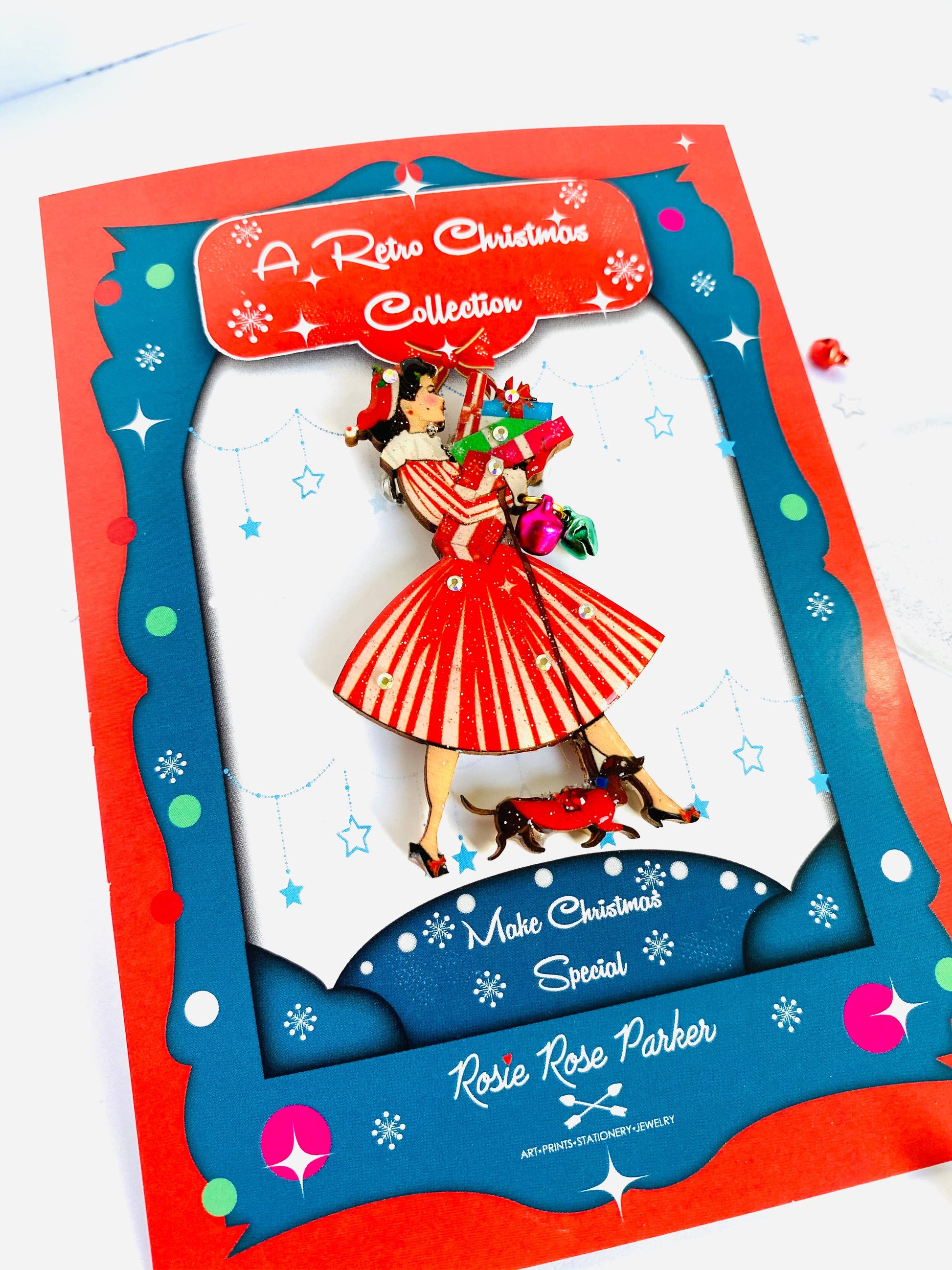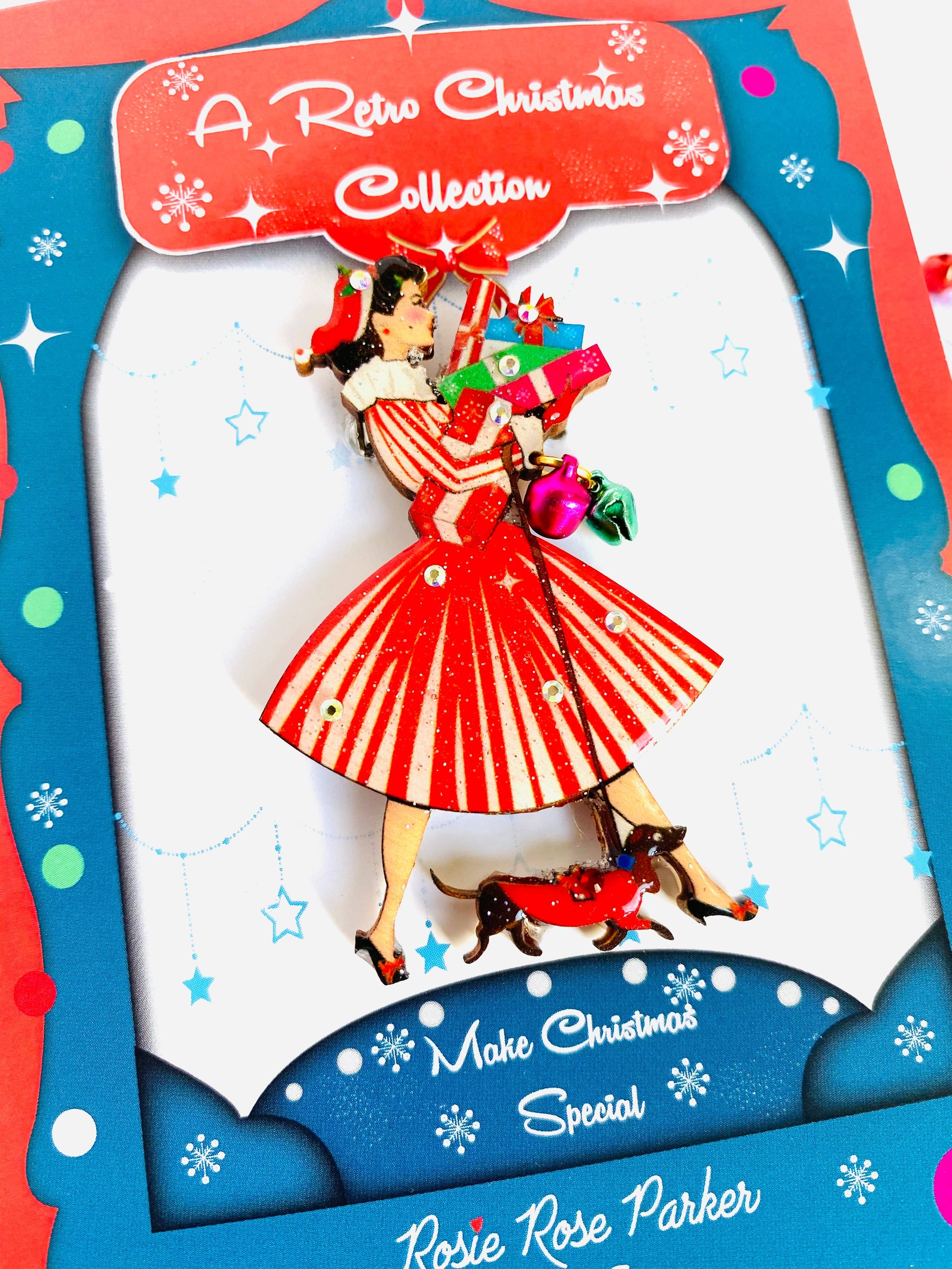 Pen julebrosje fra 1950-tallet med gaver og dachshund. Brossjen består av 3 julebjeller som henger fra håndleddet hennes. En så nydelig festlig 1950-tallsinspirert brosje!