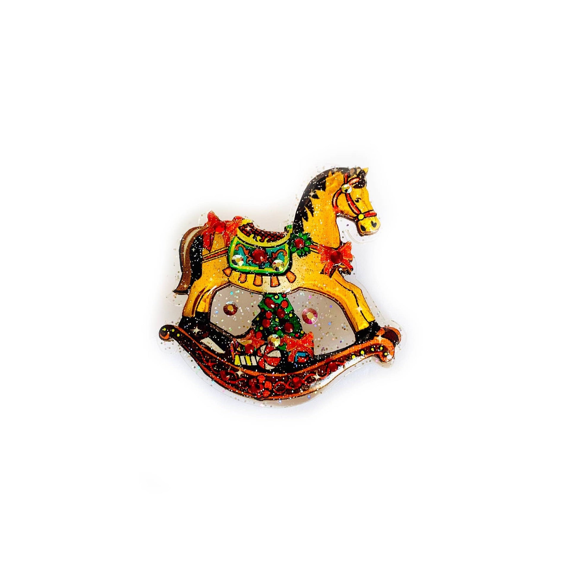Gjør julen spesiell med denne supersøte gyngehest-brosjen. Fullt illustrert av Rosie Rose Parker og plassert på glitter-akryl. En fantastisk julegave full av magisk tradisjonell lekestil.