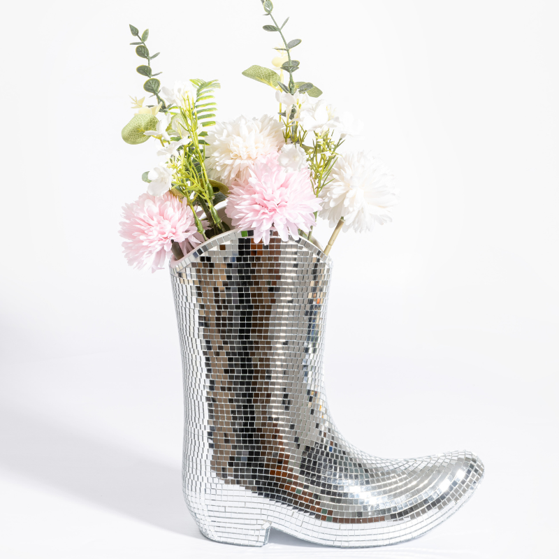 đȘ©đ€ La deg forfĂžre av det frekke glitrende uttrykket til vĂ„r Disco Santiag Vase â en ekte statement-piece dekket fra topp til tĂ„ i speilmosaikk. Den kombinerer det rebelske fra Ville Vesten med energien fra en skikkelig disco-natt, og resultatet er alt annet enn kjedelig.