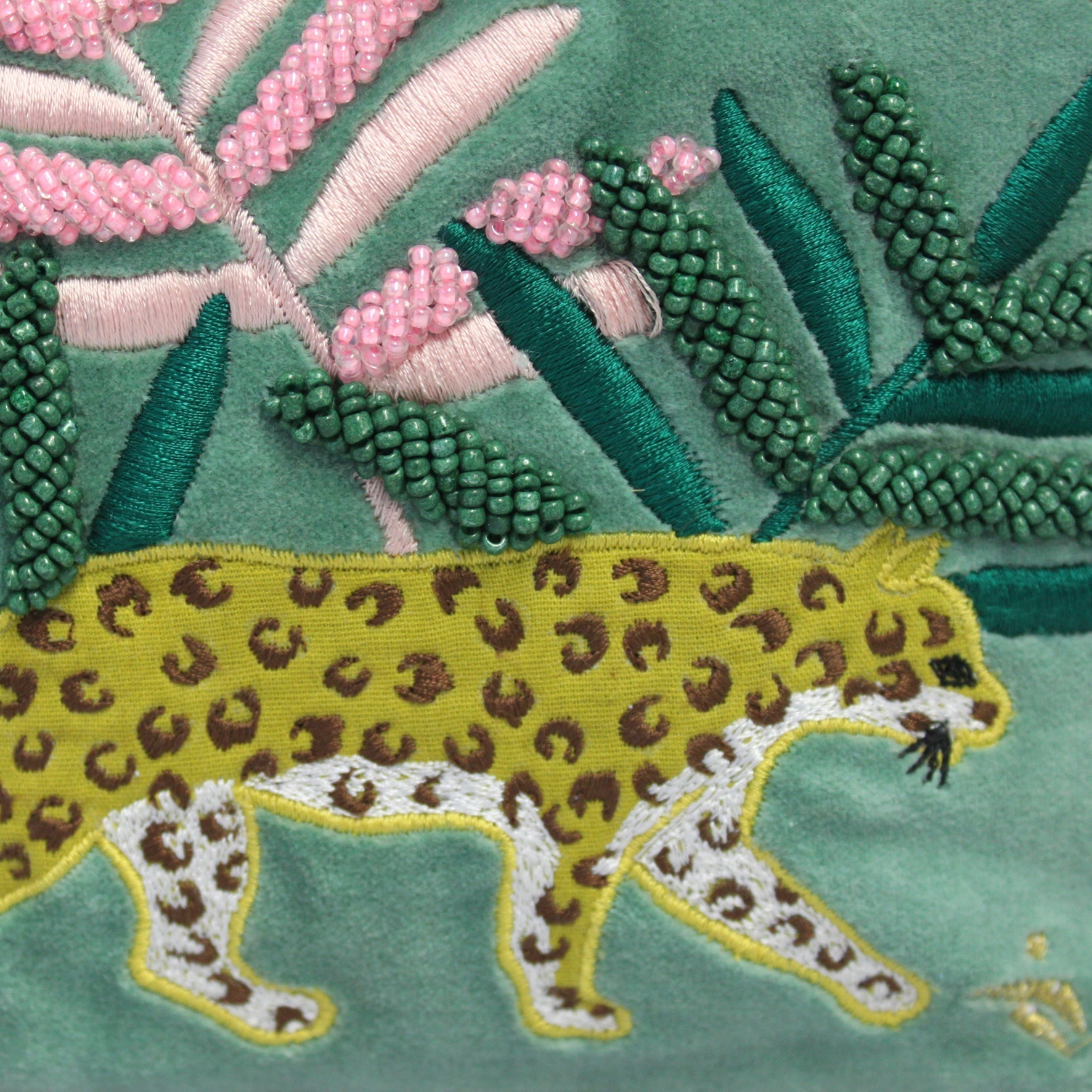 Her er sminkevesken som sier “jeg våkner glamorøs” – selv om sannheten er mascara på haka og concealer i håret. Laget i myk salviegrønn bomullsfløyel, brodert med leopard og jungelblader i perler, er denne vesken en liten jungelfest du kan ta med deg overalt.