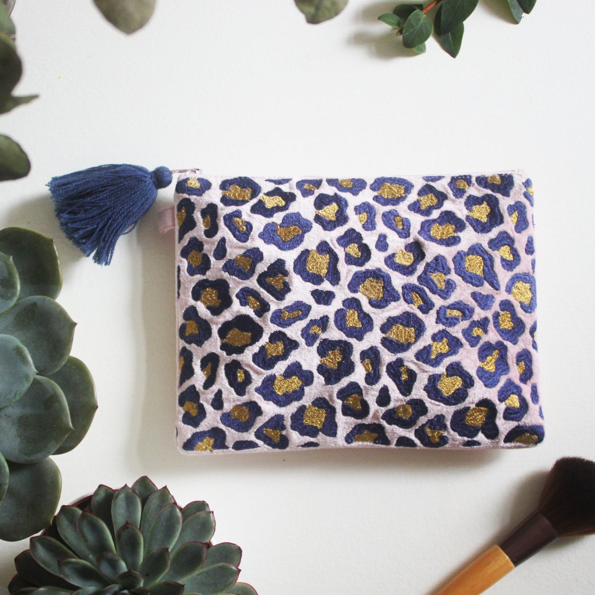 Her er pungen som sier “jeg er glam, men jeg har også claws.” Laget i myk bomullsfløyel med leopardmønster og broderte detaljer, er denne blushrosa skjønnheten akkurat passe vill – og akkurat passe sofistikert. Den marineblå dusken gir deg den rette “jeg har kontroll på livet mitt”-følelsen, mens den avtakbare håndleddsstroppen lar deg velge mellom casual og “jeg er på vei til en fest jeg ikke egentlig vil på.”