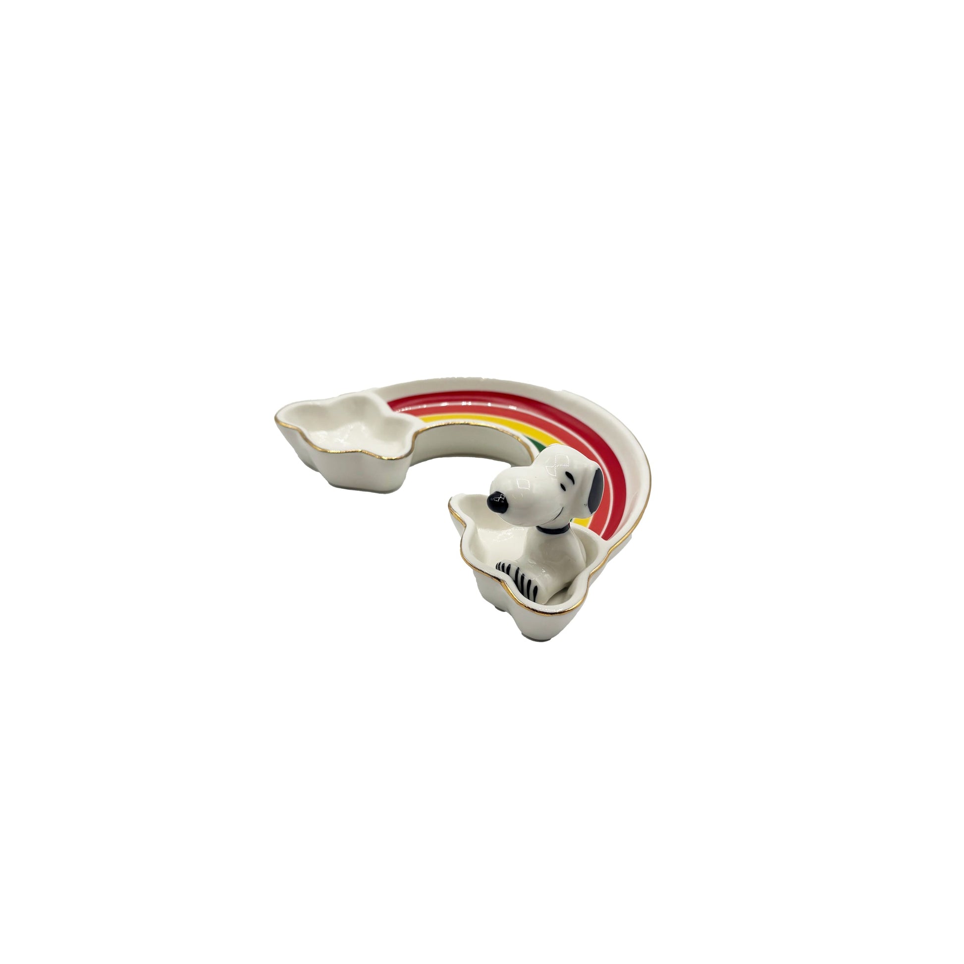 Her er smykkefatet som gir deg regnbue, retro og ren glede – alt i én liten porselensskatt. Formet som en tegneserie-regnbue med fluffy hvite skyer og en 3D-Snoopy som sitter oppreist og ser ut som han venter på at du skal ta av deg smykkene og senke skuldrene.