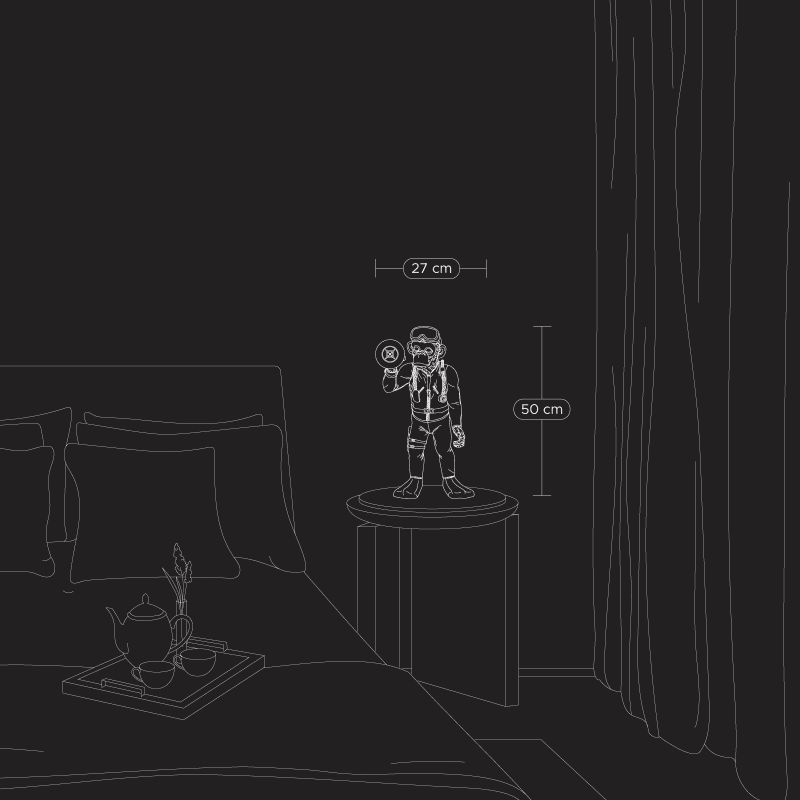 Den gullfargede dykkeren balanserer mellom humor og kunstnerisk uttrykk, og skaper et blikkfang som både er dekorativt og stemningsskapende. Lampen er laget av polyresin, noe som gir en solid og detaljert finish, og den generøse størrelsen på 27 × 31 × 49,5 cm gjør den til et tydelig statement‑objekt i rommet.