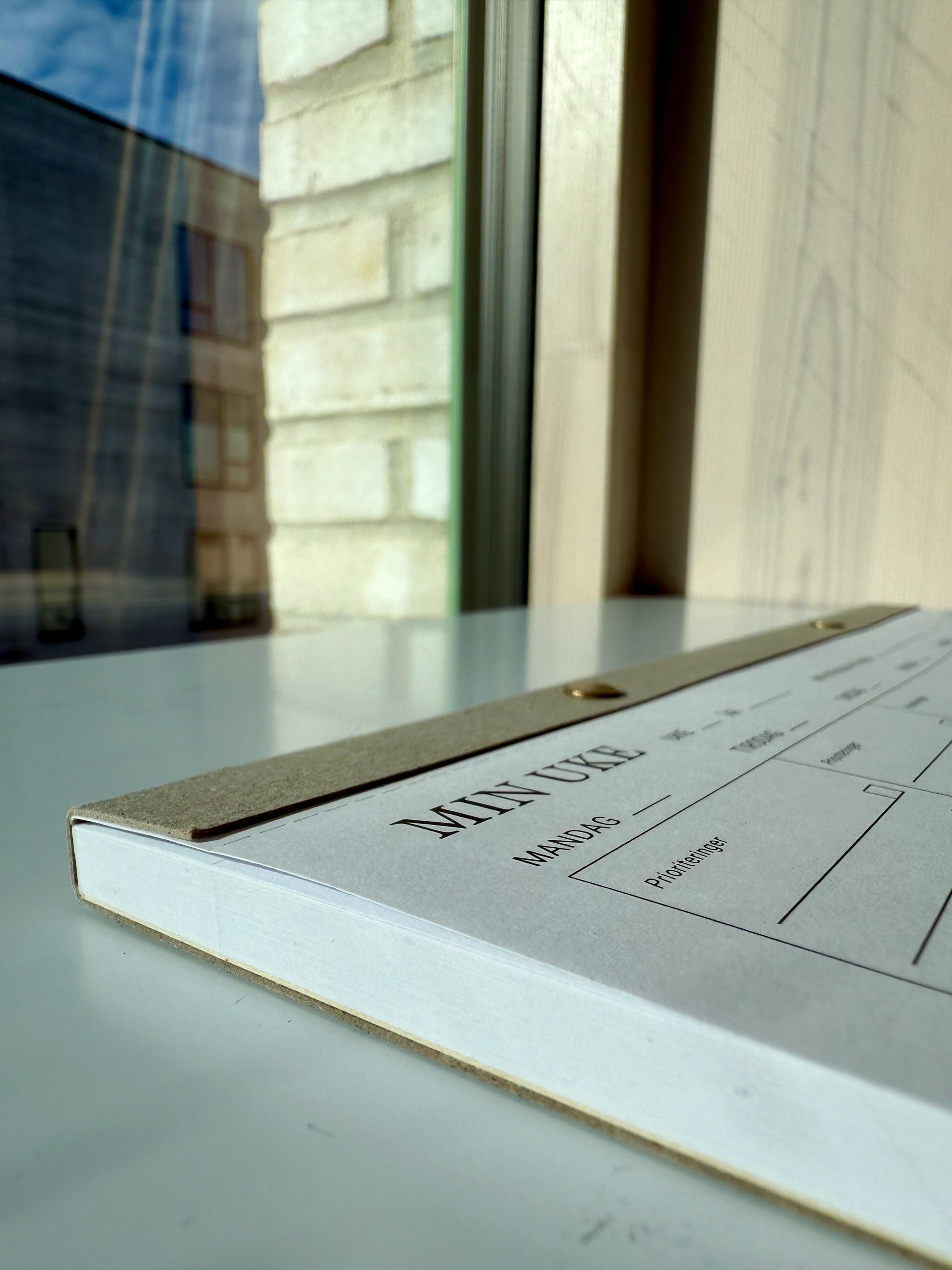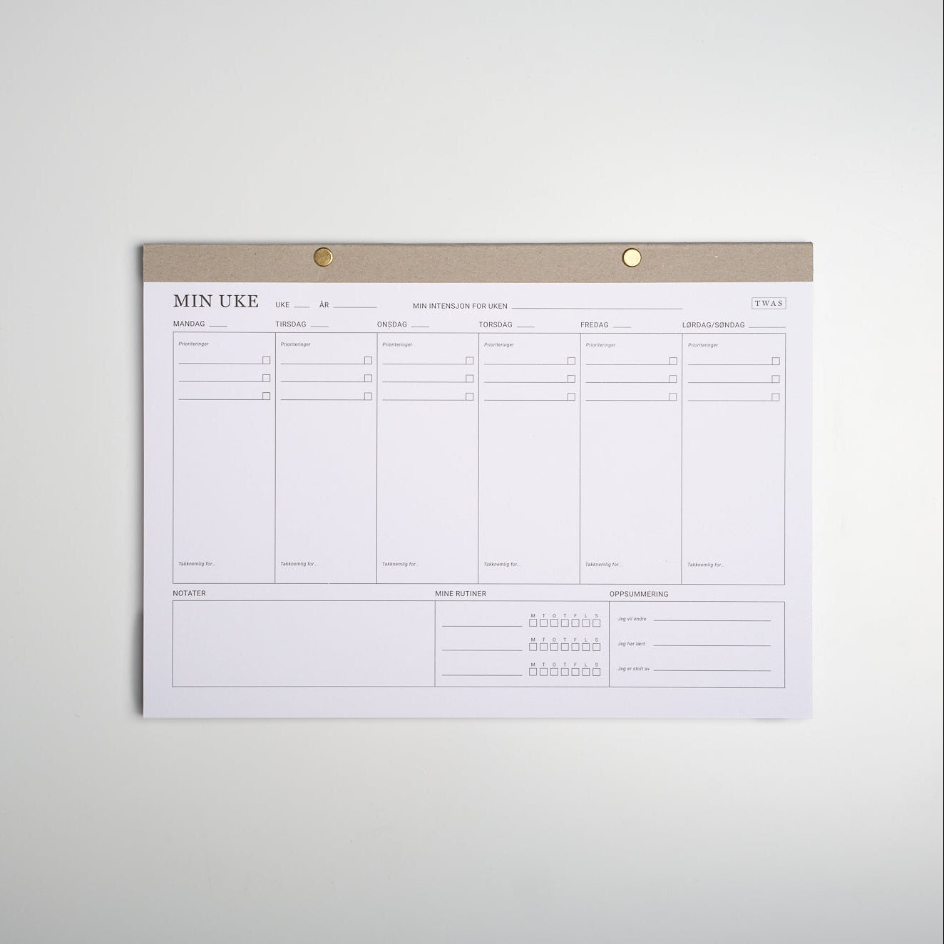 TWAS Ukesplanlegger – MIN UKE Et lekkert verktøy til bruk i hverdagen, når du skal planlegge uken eller holde oversikt med alt som skjer. Første utgaven ble helt utsolgt. September 2025 kommer den i oppdatert design. Ukeplanleggeren er innbundet med bakpapp og bokskruer. Arkene har perforering som gjør det enkelt å rive av sidene.